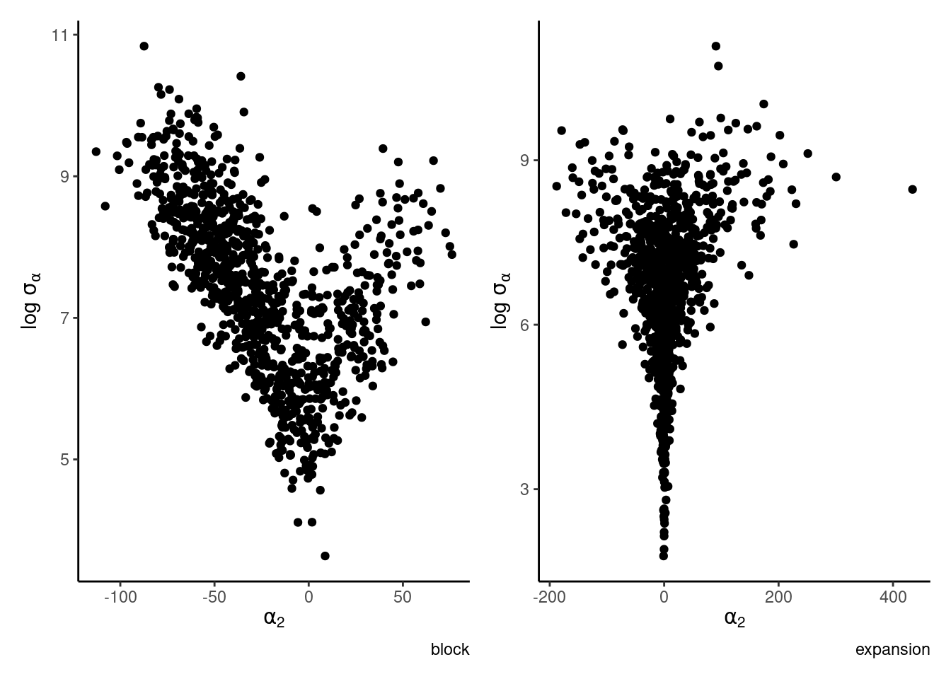 as well as pairs plot of \(\alpha_i, \log \sigma_{\alpha}\). The latter should display a very strong funnel.
