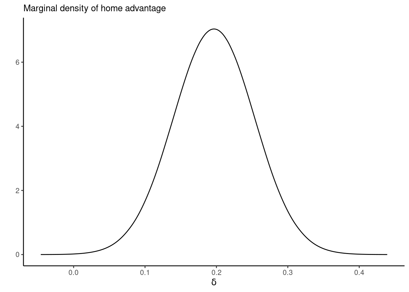 labs(x = expression(delta), y = "", subtitle = "Marginal density of home advantage") +