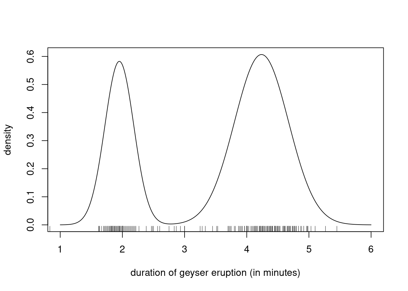 geyserdata fromMASSR package for \(K=2\) until convergence with \(\alpha=0.1, a=b=0.01.\) Repeat multiple times with different initializations and save the ELBO for each run. - Repeat these steps for \(K=2, \ldots, 6\) and plot the ELBO as a function of \(K\). Comment on the optimal number of cluster components suggested by the approximation to the marginal likelihood.