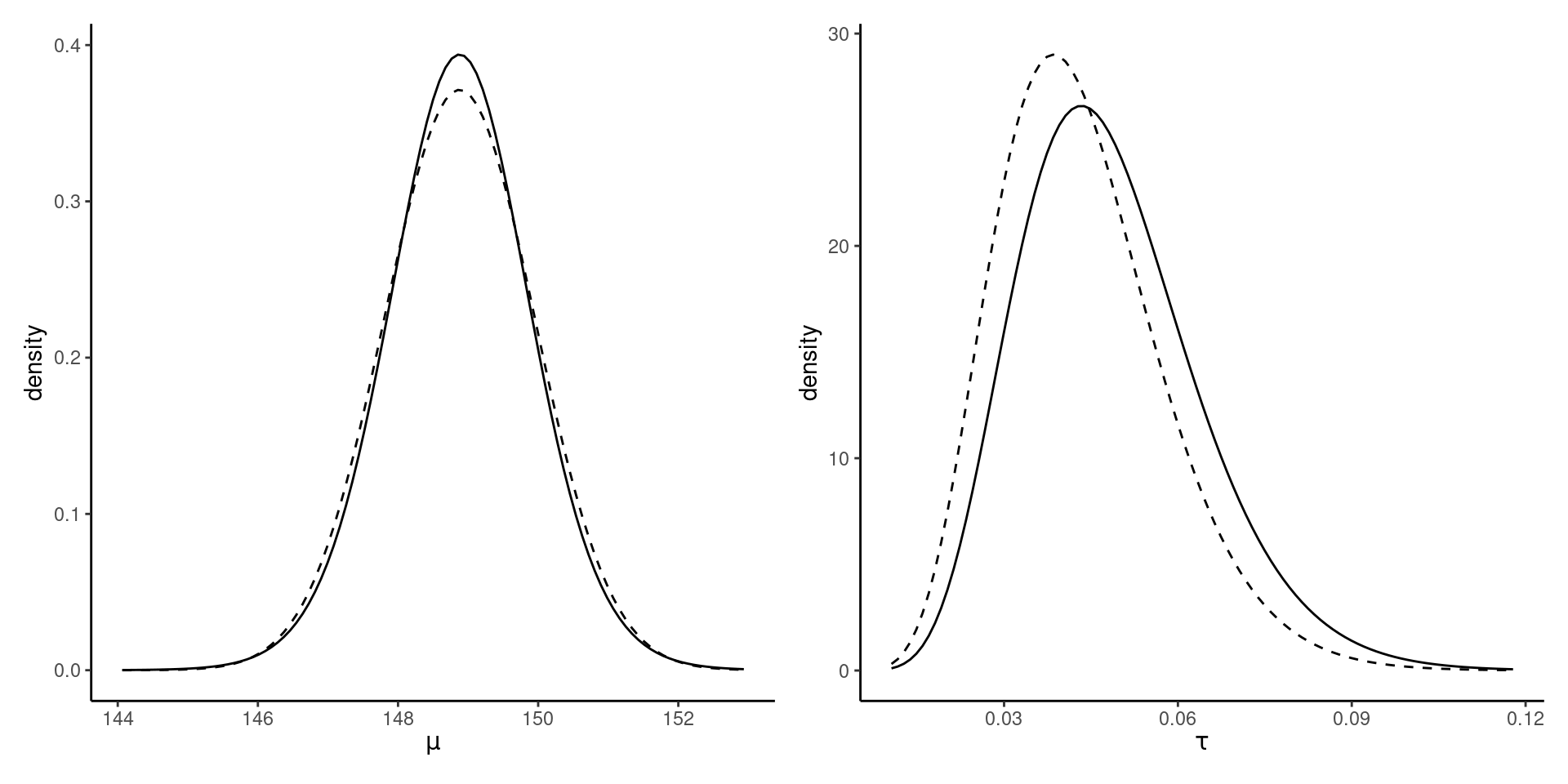 Figure 3: Marginal posterior density of the mean and precision of the Gaussian (full line), with CAVI approximation (dashed).