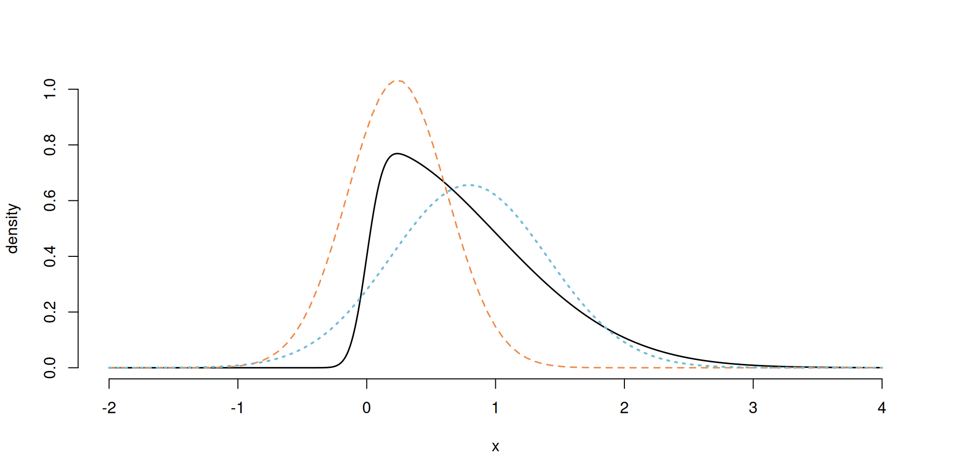 Figure 1: Skewed density with the Laplace approximation (dashed orange) and variational Gaussian approximation (dotted blue).
