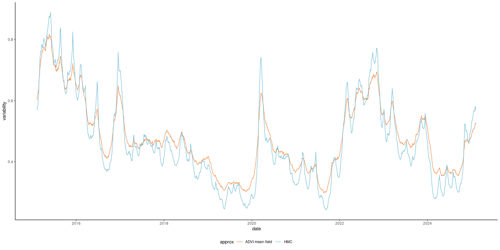 Fitting HMC-NUTS to the exchange rate data takes 156 seconds for 10K iterations, vs 2 seconds for the mean-field approximation.