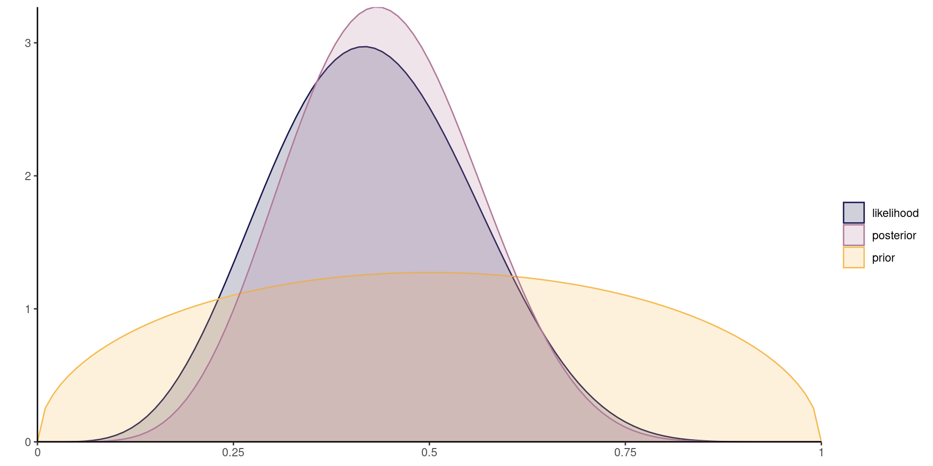 Figure 2: Scaled Binomial likelihood for six successes out of 14 trials, \(\mathsf{beta}(3/2, 3/2)\) prior and corresponding posterior distribution from a beta-binomial model.