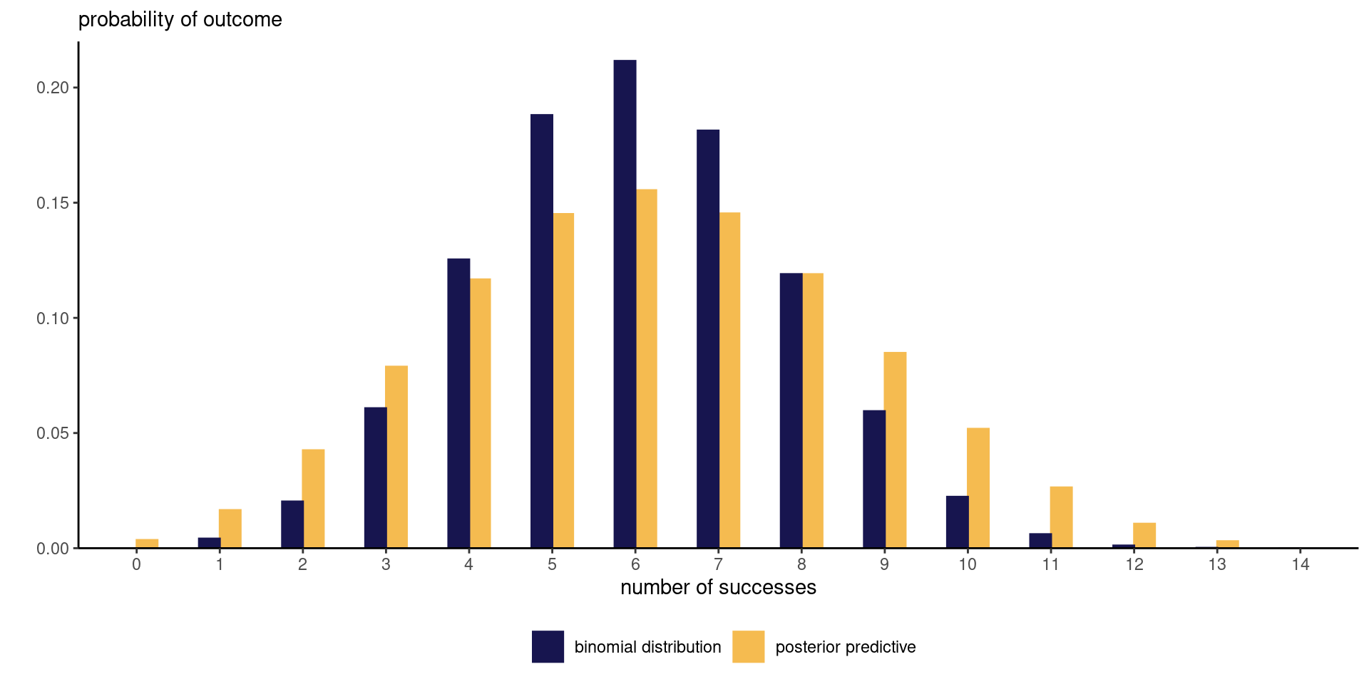Figure 5: Beta-binomial posterior predictive distribution with corresponding binomial mass function evaluated at the maximum likelihood estimator.