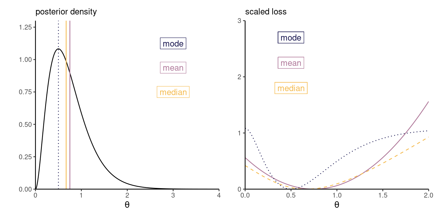 Figure 7: Posterior density with mean, mode and median point estimators (left) and corresponding loss functions, scaled to have minimum value of zero (right).