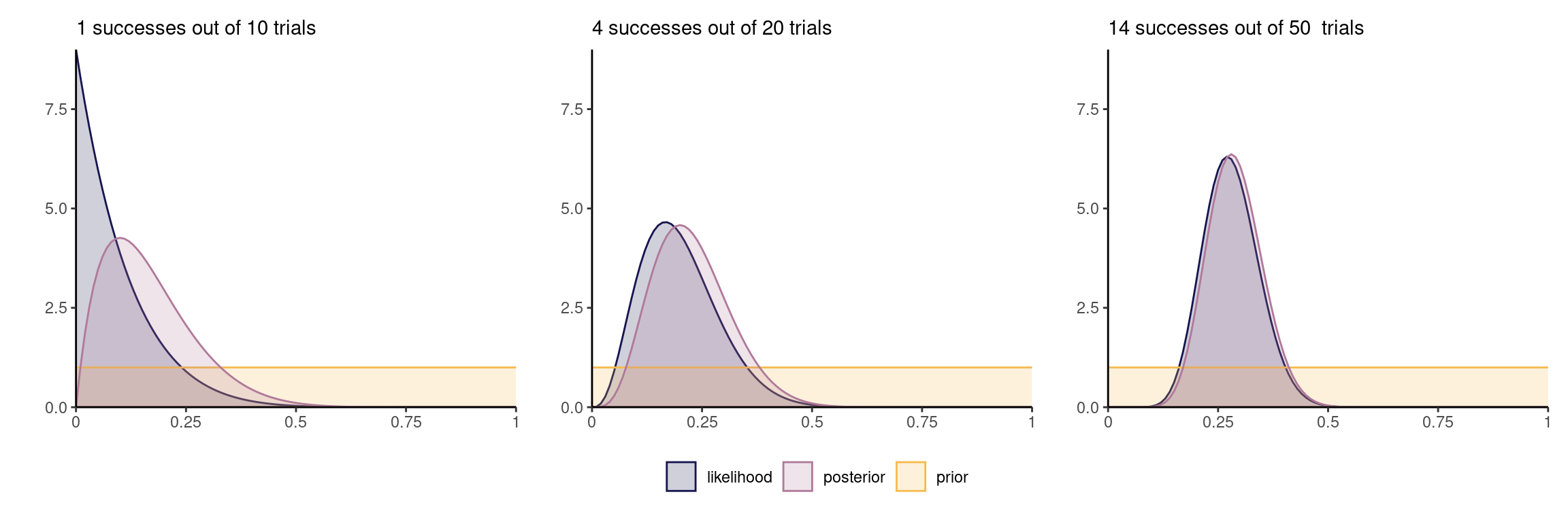Figure 4: Beta posterior and binomial likelihood with a uniform prior for increasing number of observations (from left to right).