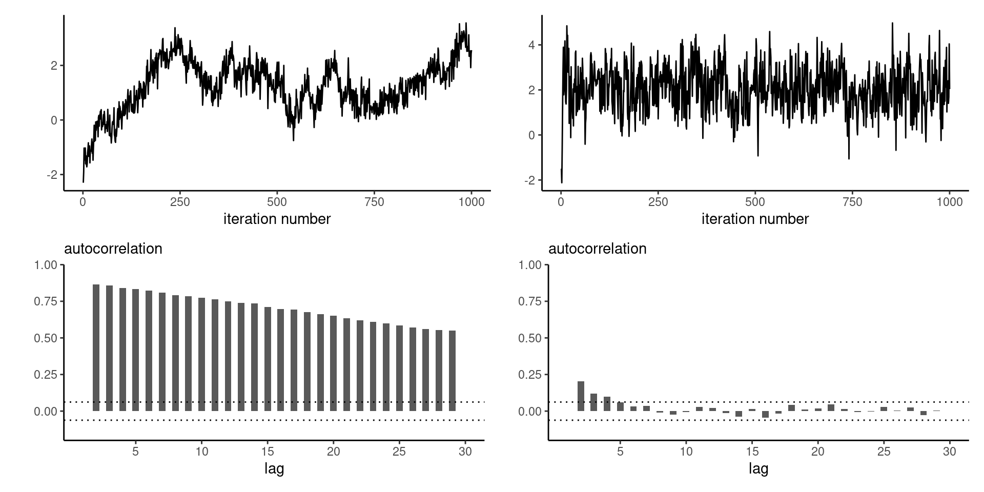 Figure 4: Trace plots (top) and correlograms (bottom) for the first component of a Gibbs sampler with \(d=20\) equicorrelated Gaussian variates with correlation \(\rho=0.9\) (left) and \(d=3\) with equicorrelation \(\rho=0.5\) (right).
