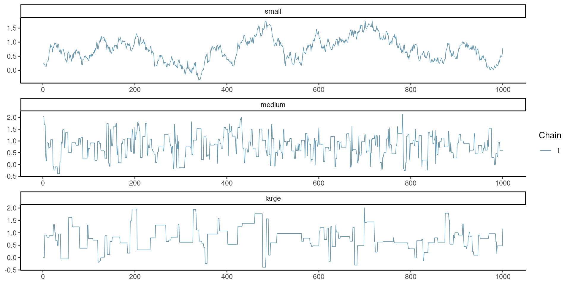 Figure 1: Example of traceplot with proposal variance that is too small (top), adequate (middle) and too large (bottom).