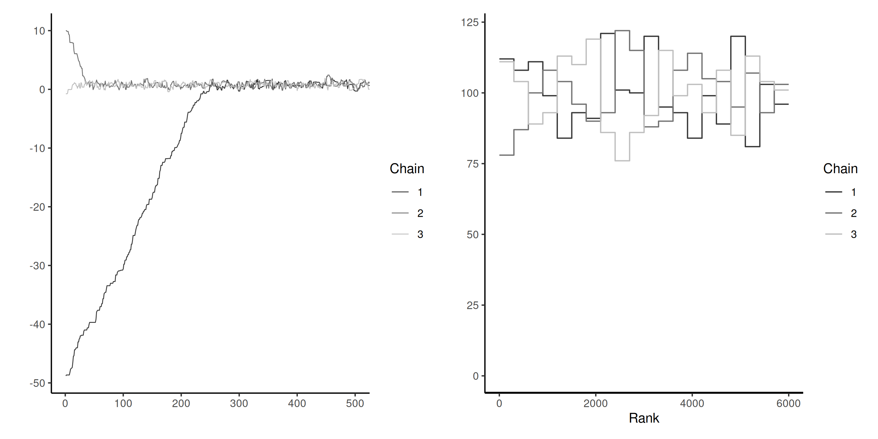 Figure 2: Traceplots of three Markov chains for the same target with different initial values for the first 500 iterations (left) and trace rank plot after discarding these (right). The latter is indicative of the speed of mixing.
