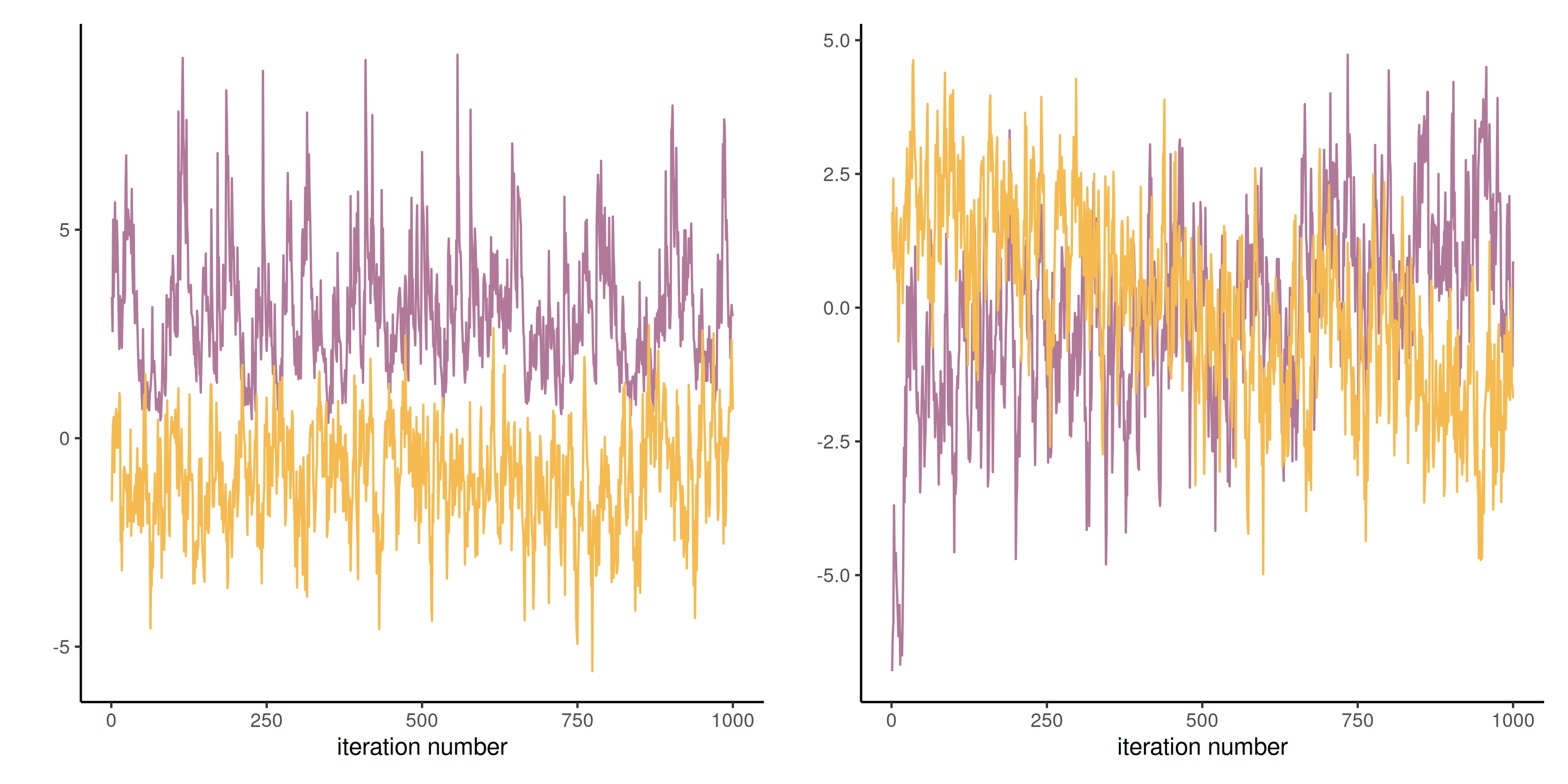 Figure 3: Two pairs of Markov chains: the top ones seem stationary, but with different modes and \(\widehat{R} \approx 3.4\). The chains on the right hover around zero, but do not appear stable, with \(\widehat{R} \approx 1.6\).