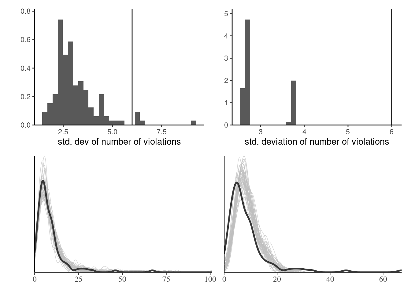 Figure 4: Posterior predictive checks for the standard deviation (top) and density of posterior draws (bottom) for hierarchical Poisson model with individual effects (left) and simpler model with only conditions (right).