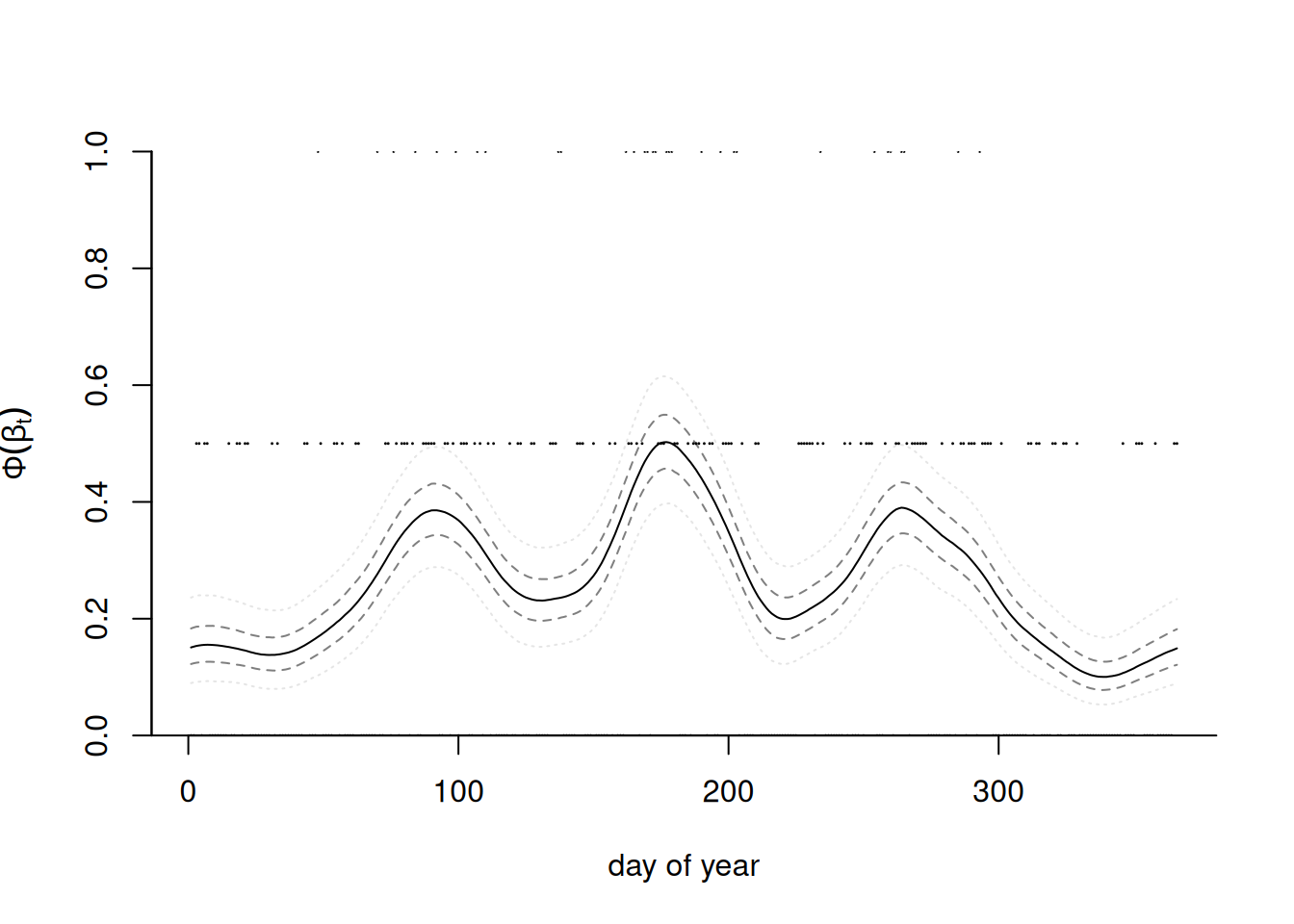 We consider data from Kitagawa (1987) that provide a binomial time series giving the number of days in years 1983 and 1984 (a leap year) in which there was more than 1mm of rain in Tokyo; see section 4.3.4 of Rue & Held (2005).