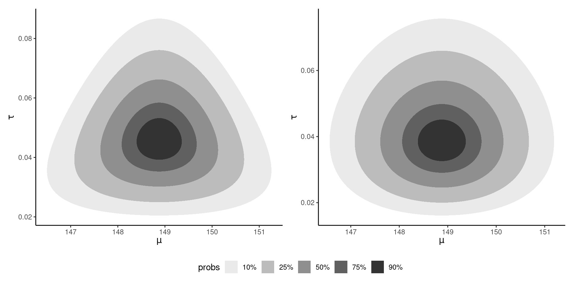 Figure 2: Bivariate density posterior for the conjugate Gaussian-gamma model (left) and CAVI approximation (right).