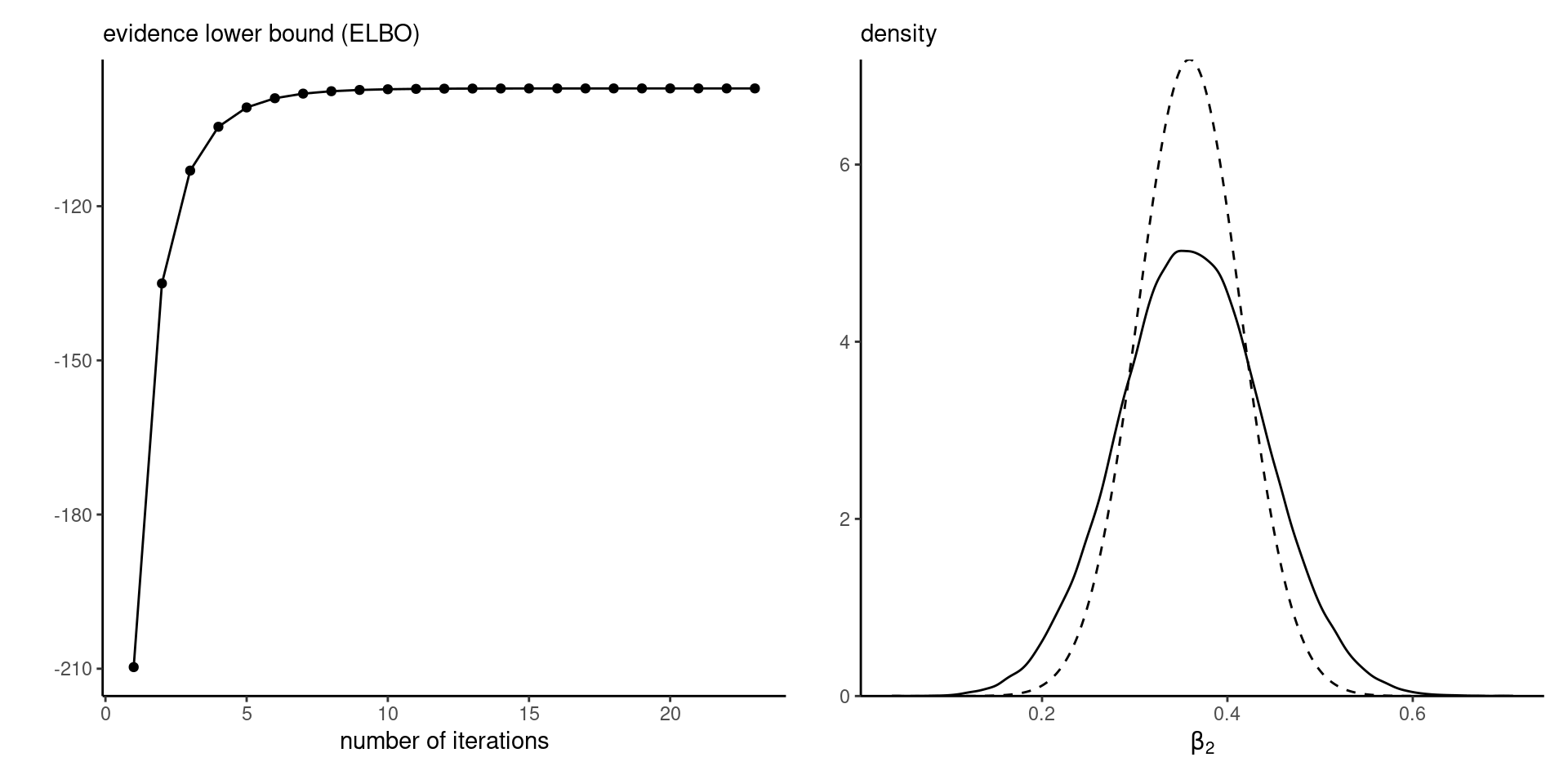 Figure 4: ELBO (left) and marginal density approximation with true density (full) versus variational approximation (dashed).
