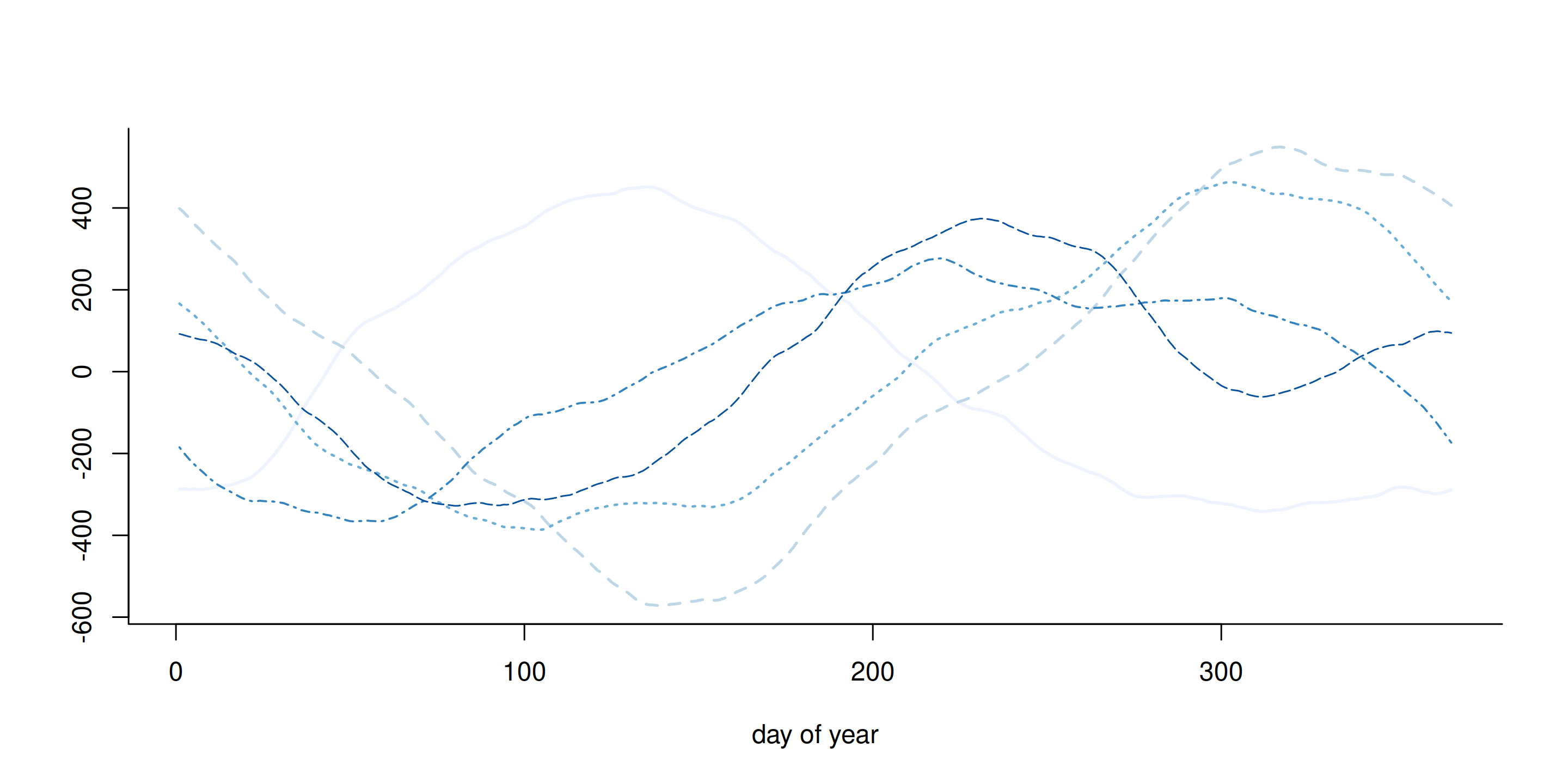 This amounts to specifying the process with for \(t \in \mathbb{N} \mod 366 + 1\) \[\begin{align*} \Delta^2\beta_t &= (\beta_{t+1} - \beta_t) - (\beta_t - \beta_{t-1}) \\&=-\beta_{t-1} +2 \beta_t - \beta_{t+1} \sim \mathsf{Gauss}(0, \tau^{-1}). \end{align*}\]