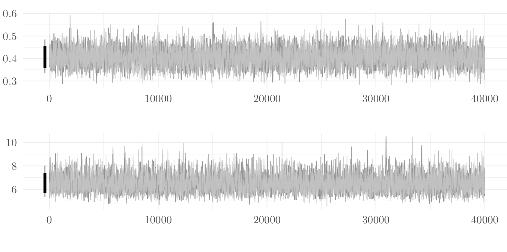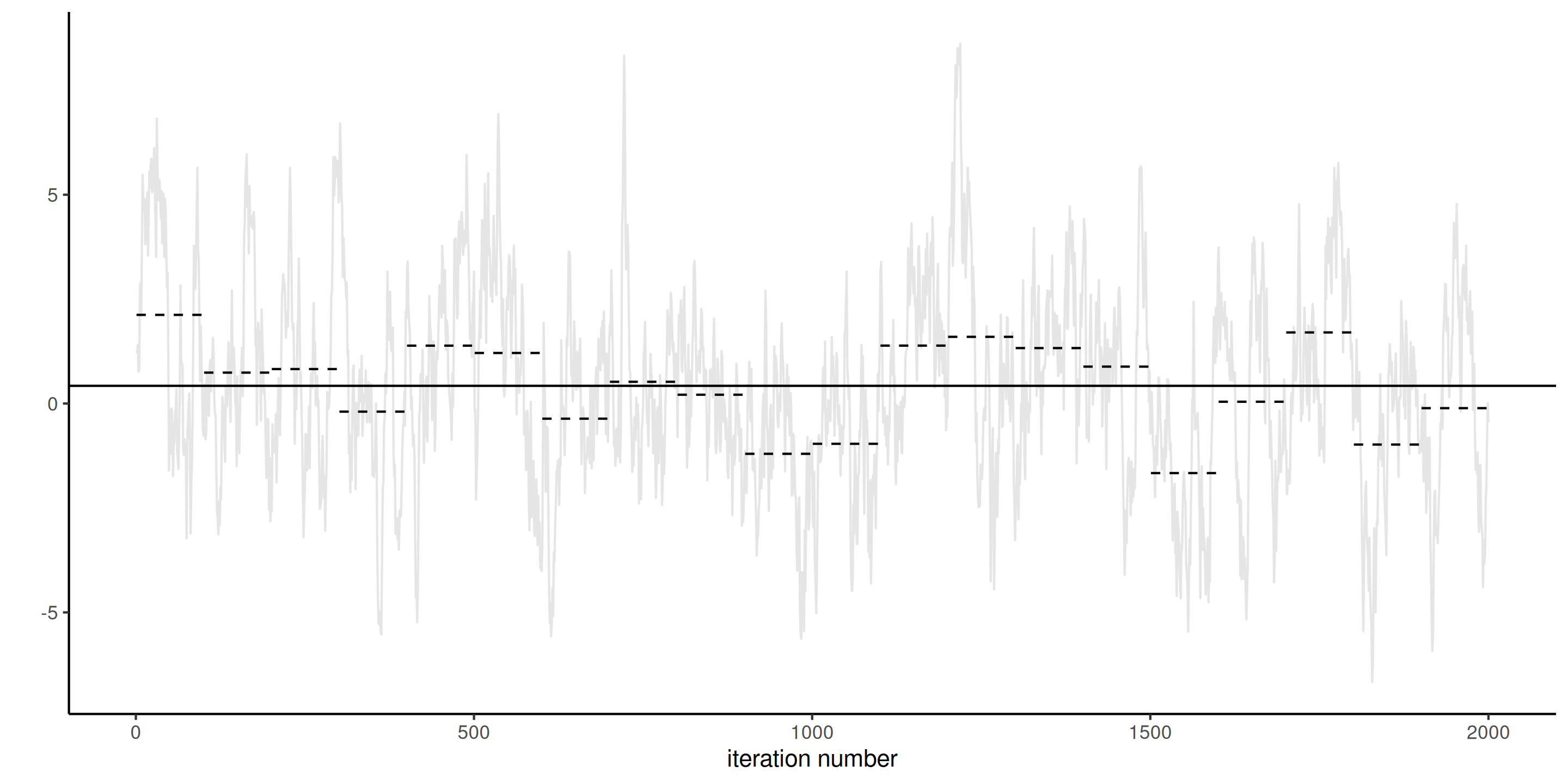 Denote by \(\theta_{bm}\) the \(b\)th draw of the \(m\)th chain, we compute the global average \[\overline{\theta} = \frac{1}{BM}\sum_{b=1}^B \sum_{m=1}^m \theta_{bm}\] and similarly the chain-specific sample average and variances, respectively \(\overline{\theta}_m\) and \(\widehat{\sigma}^2_m\) (\(m=1, \ldots, M\)).