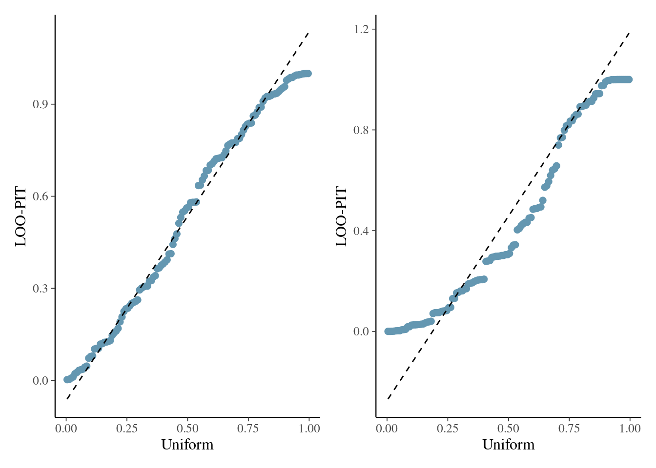 Figure 5: Quantile-quantile plots based on leave-one-out cross validation for model for the hierarchical Poisson model fitted to the Upworthy data with the individual random effects (left) and without (right).