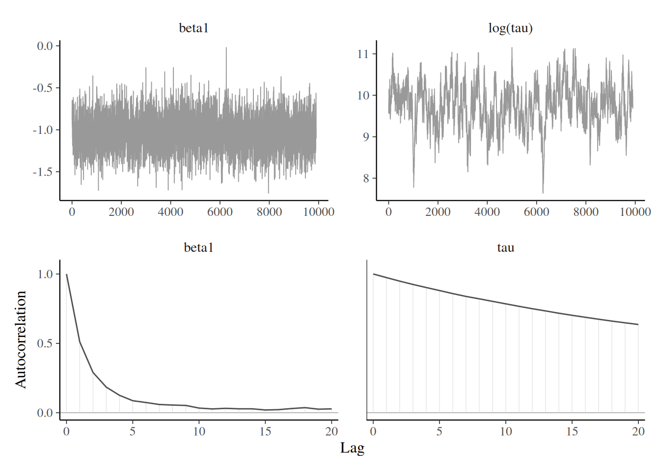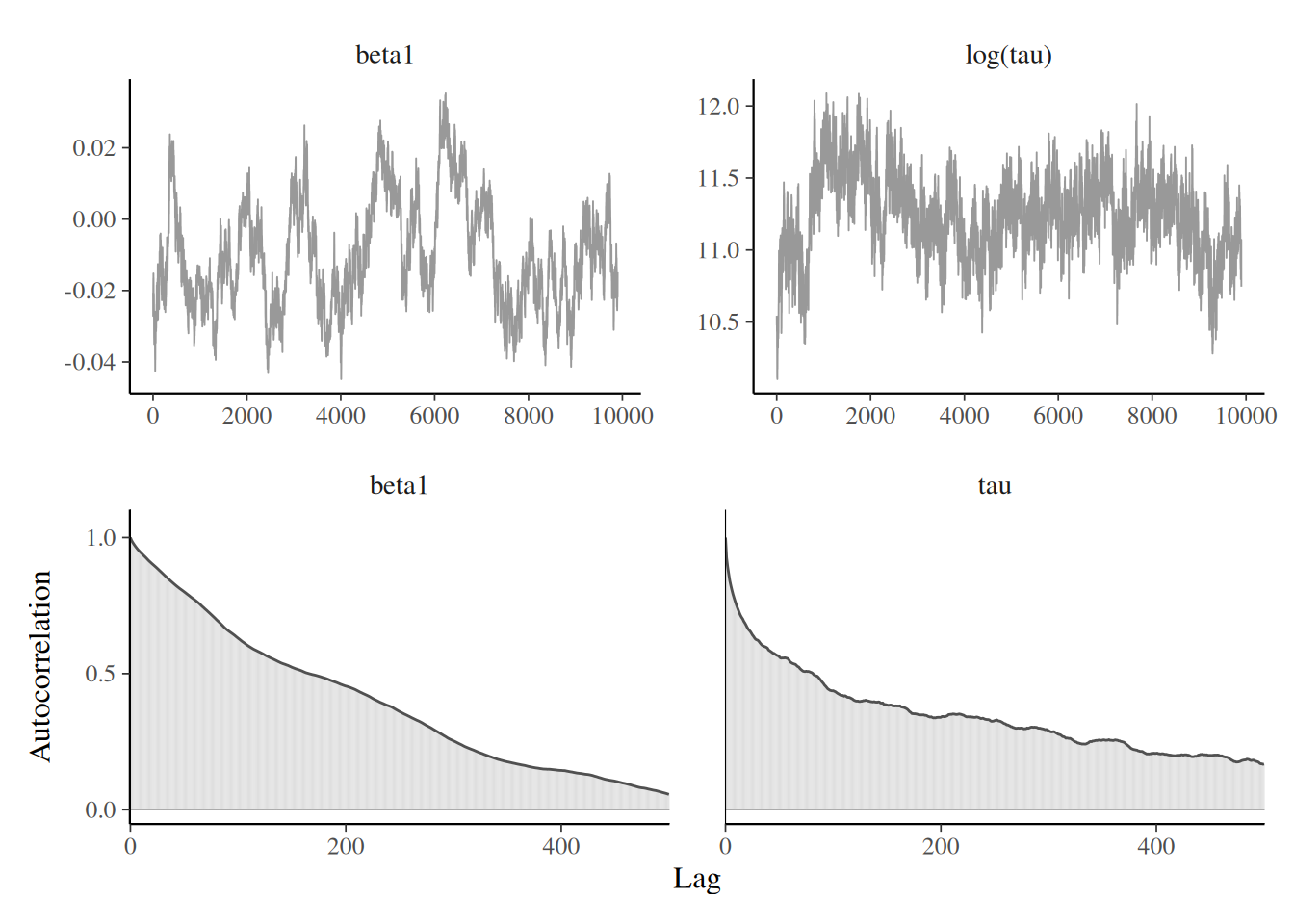 A better avenue would be to use a Metropolis random walk for \(\tau^{\star}\), simulate \(\boldsymbol{\beta} \mid \tau^{\star}\) and propose the joint vector \((\tau^{\star}, \boldsymbol{\beta}^{\star})\) simultaneously.