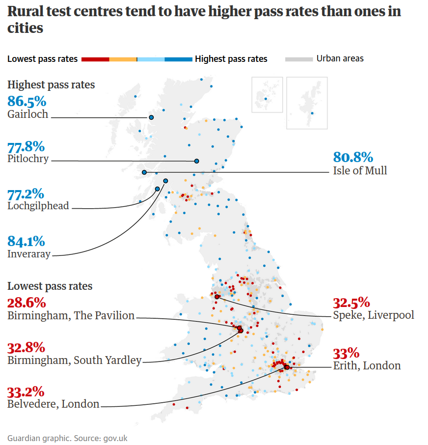 Est-ce que les examens pratiques de conduite en Grande-Bretagne sont plus faciles dans les régions à faible densité de population? Source: The Guardian, August 23rd, 2019