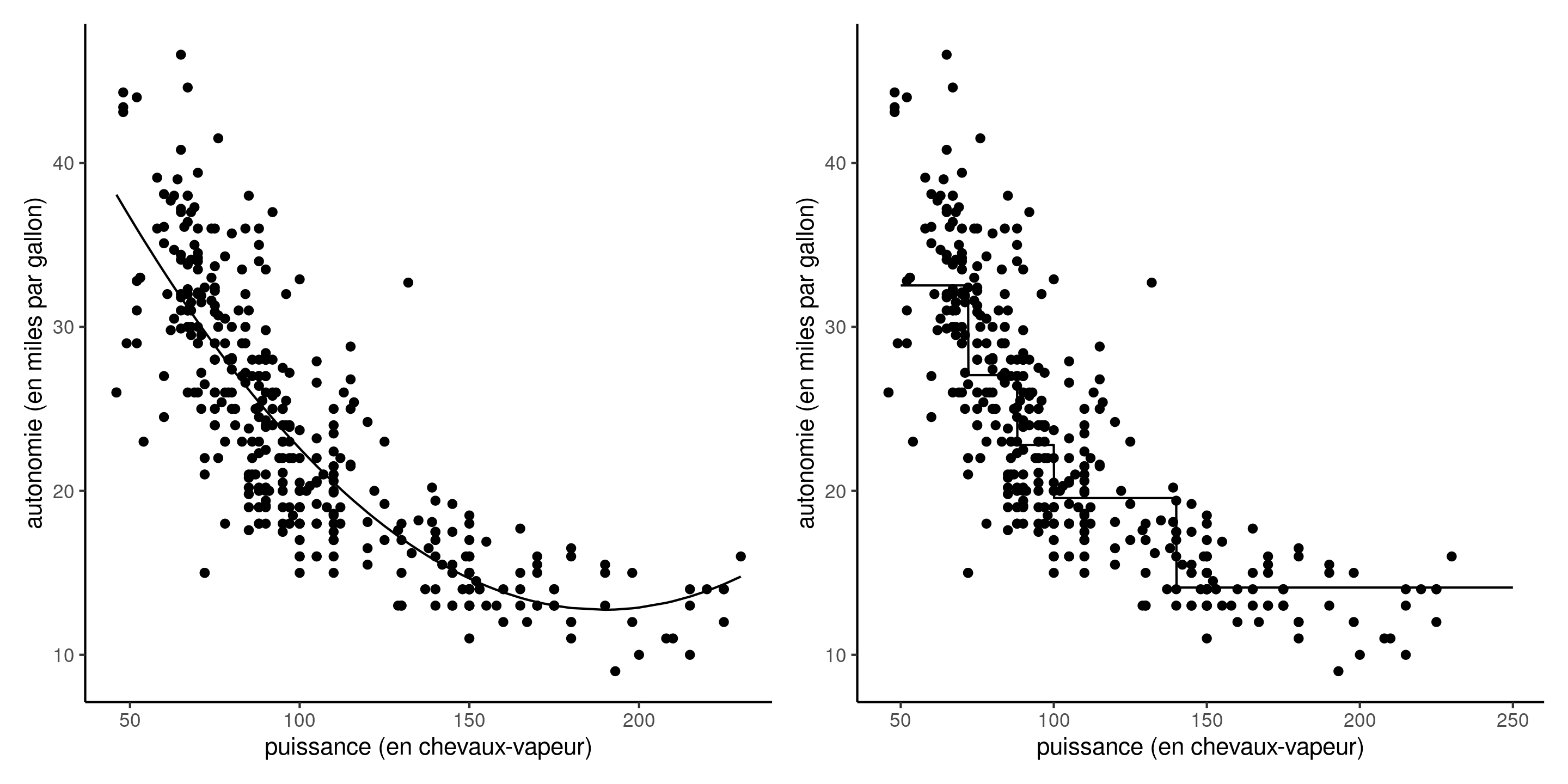 Figure 1: Régression linéaire avec terme quadratique (gauche) et modèle avec fonction de moyenne affine par morceaux pour chaque quintile (droite), pour l’autonomie d’essence de véhicules en fonction de la puissance de leur moteur.