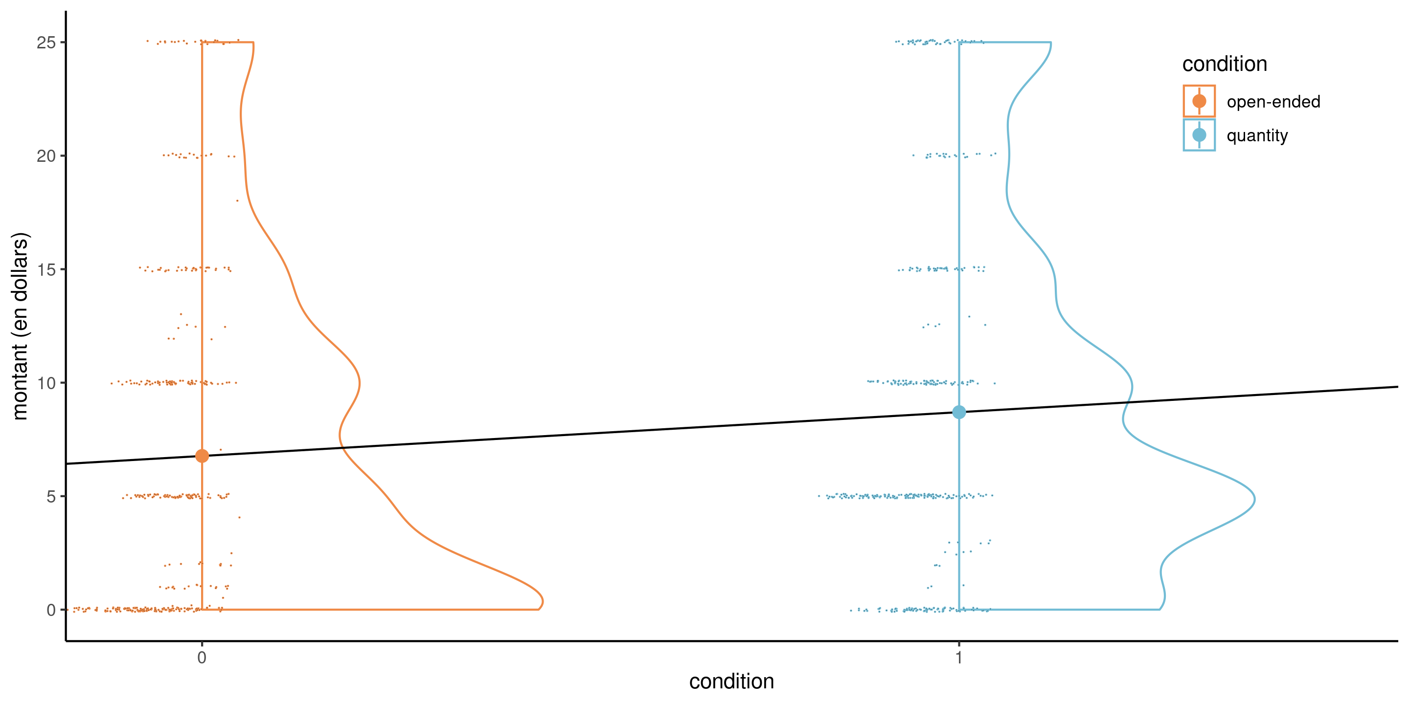 Considérons par exemple un modèle linéaire pour les données de Moon et VanEpps (2023) qui inclut le montant (amount) (en dollars, de 0 pour les personnes qui n’ont pas fait de don, jusqu’à 25 dollars).