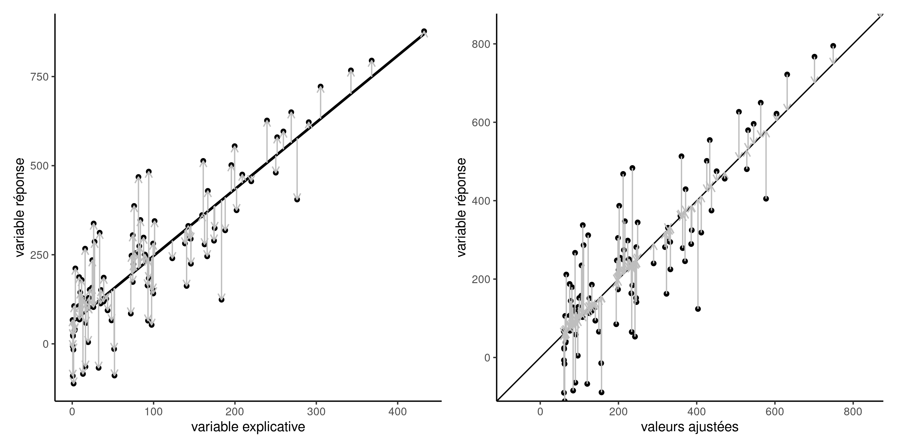 Figure 4: Résidus ordinaires \(e_i\) (vecteurs verticaux) ajoutés à la droite de régression passant dans le plan \((x, y)\) (gauche) et ajustement de la réponse \(y_i\) contre les valeurs ajustées \(\widehat{y}_i\). La droite des moindres carrés ordinaires minimise la distance au carré des résidus ordinaires.