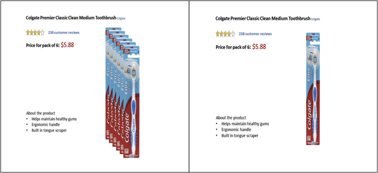 Dans leur première expérience, un paquet de six brosses à dents est vendu, mais l’image montre soit un paquet de six, soit une seule).