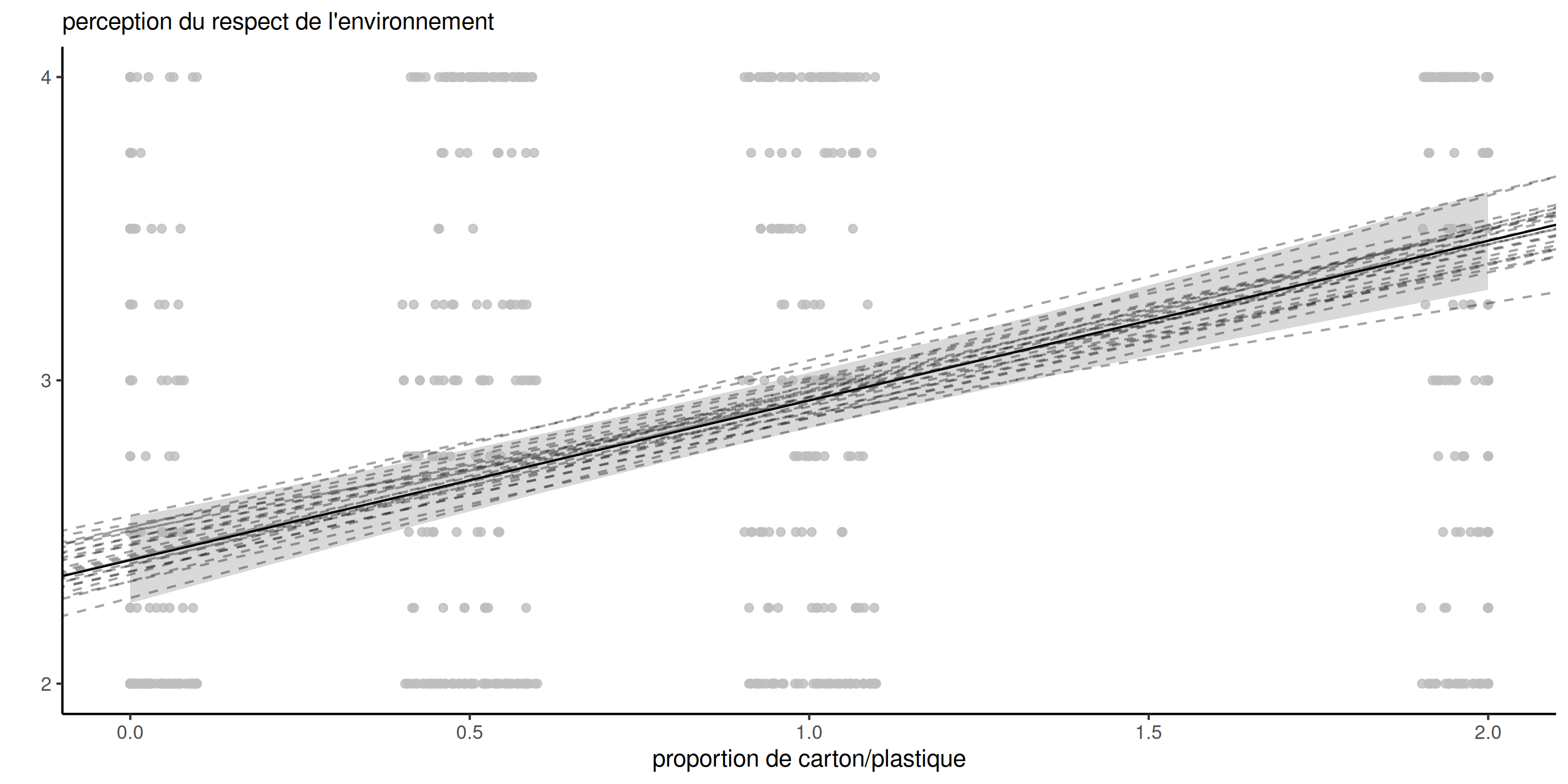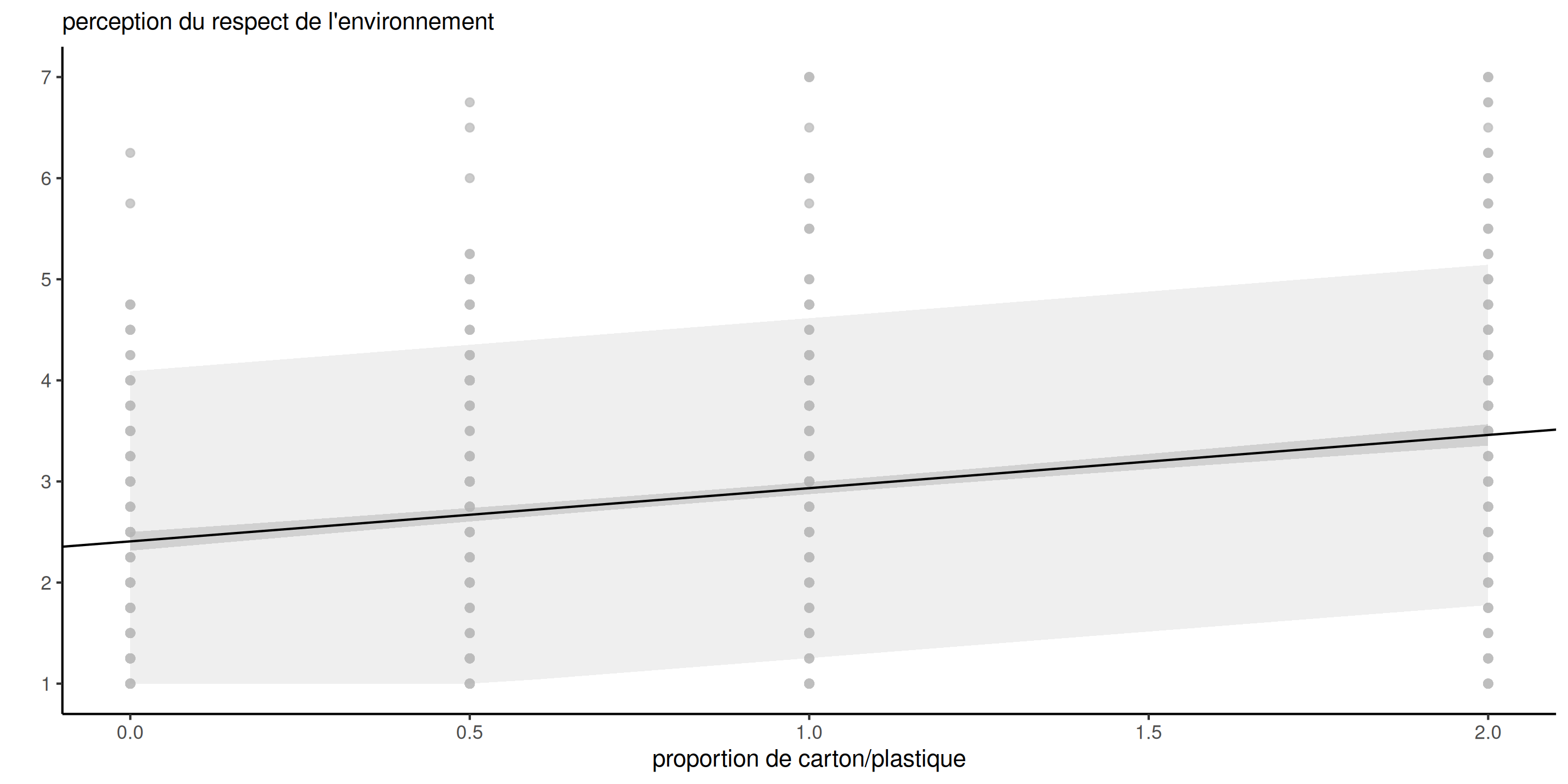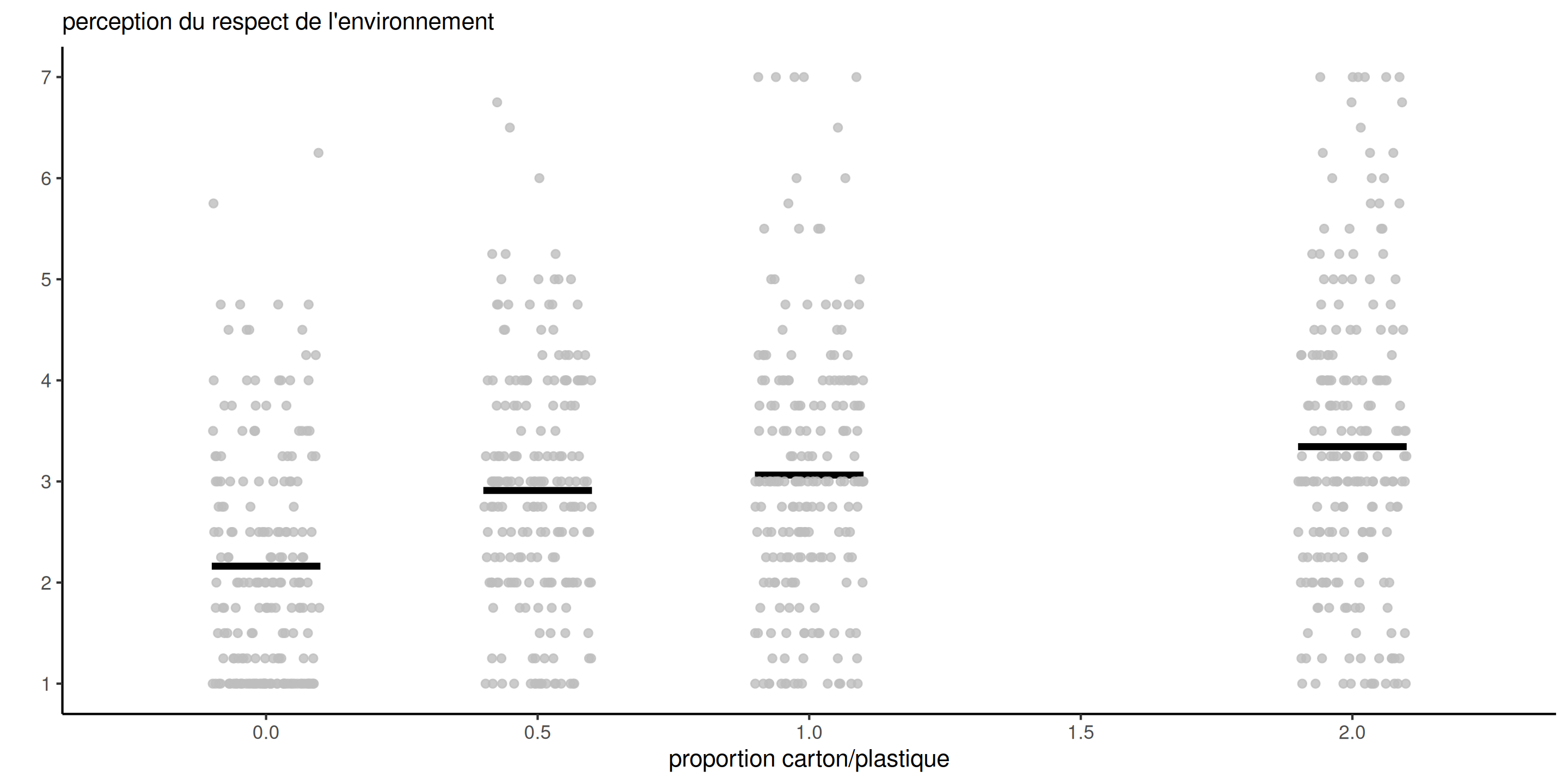 Les moyennes des groupes suggèrent que la perception du respect de l’environnement augmente avec la quantité de carton utilisée dans l’emballage.