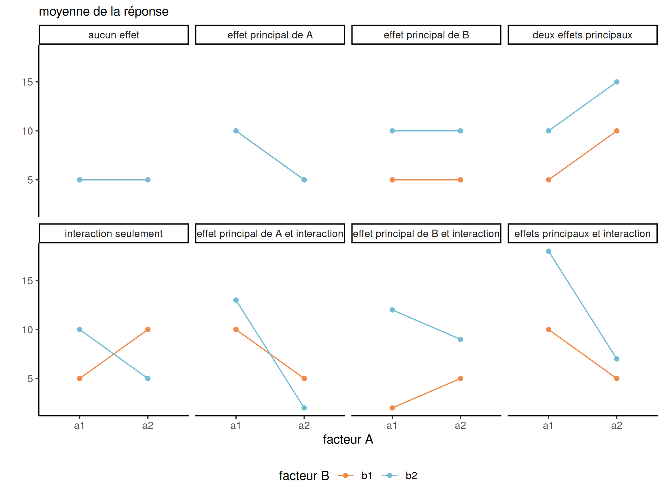 On considère un exemple avec des données bidons interaction. Le modèle additif (sans interaction) a pour moyenne \[\begin{align*}