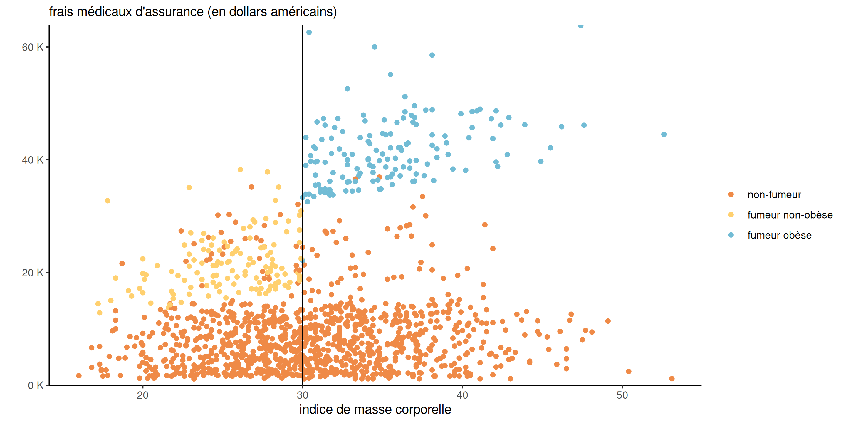 Figure 1: Nuage de points des données assurance avec les frais en fonction de l’imc, selon le status fumeur.