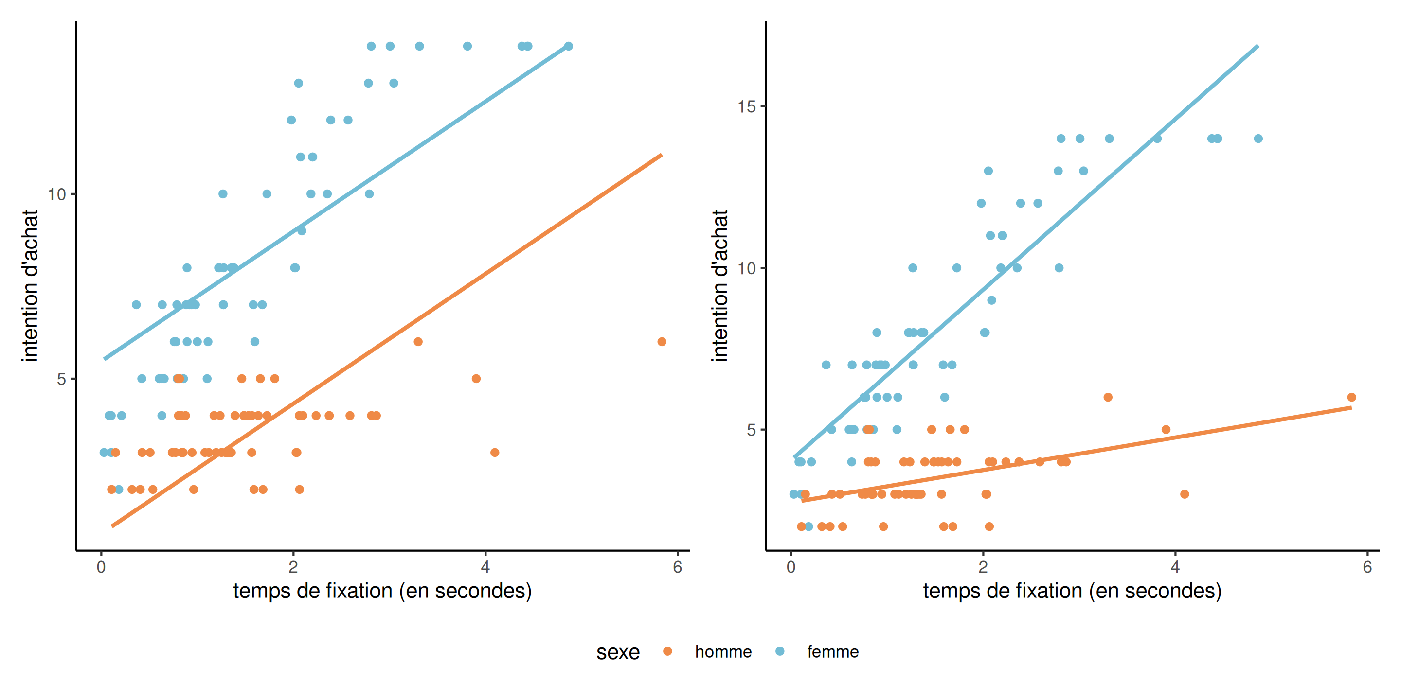 \mathsf{E}(\texttt{intention} \mid \cdot)= \beta_0 + \beta_1 \texttt{sexe} + \beta_2\texttt{fixation} + \beta_3 \texttt{fixation}\cdot \texttt{sexe}.