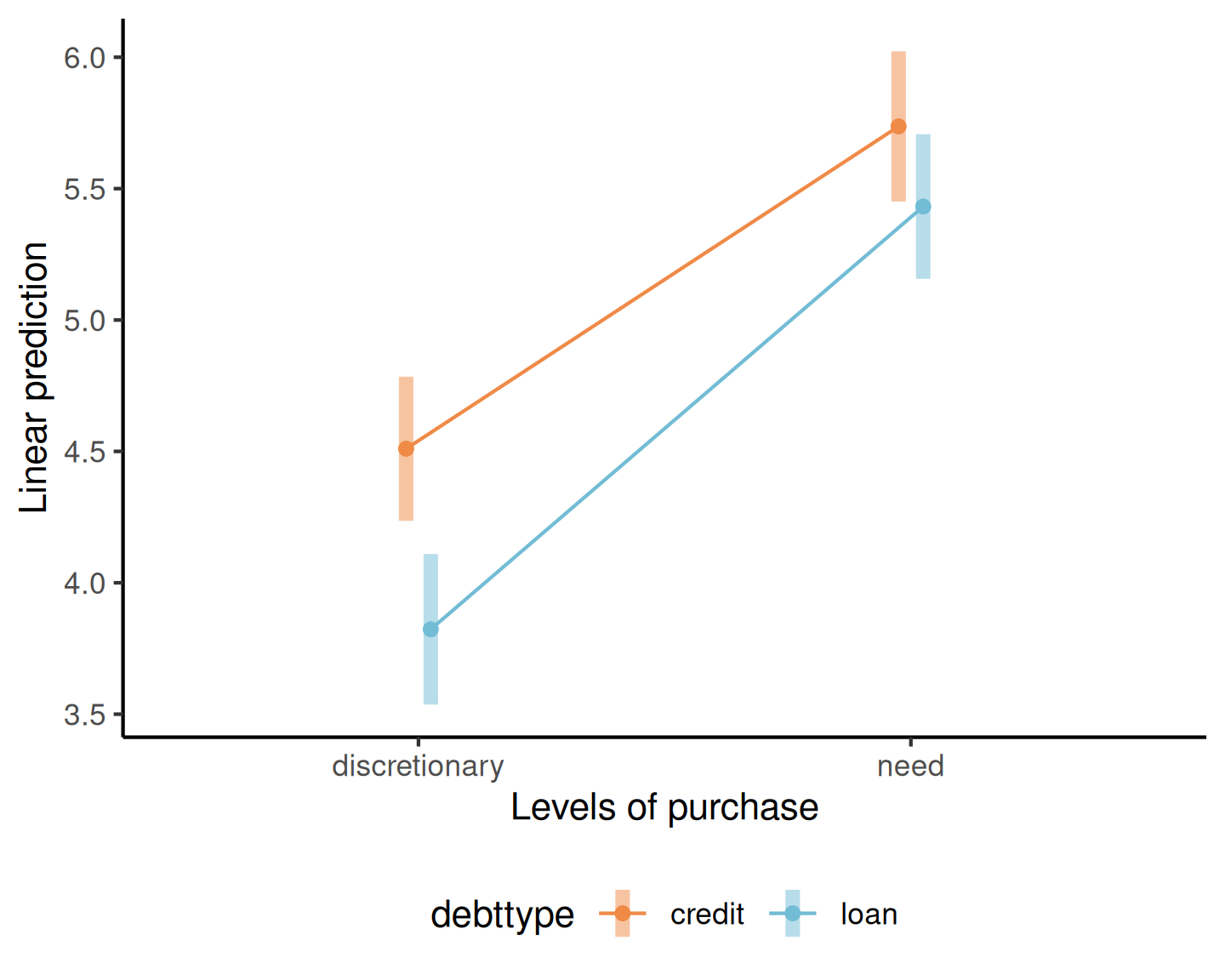 \mathsf{E}(\texttt{likelihood} \mid \cdot) &= \beta_0 + \beta_1\mathbf{1}_{\texttt{purchase=need}} + \beta_2\mathbf{1}_{\texttt{debttype=loan}} \\&\quad+ \beta_3\mathbf{1}_{\texttt{purchase=need}}\mathbf{1}_{\texttt{debttype=loan}}