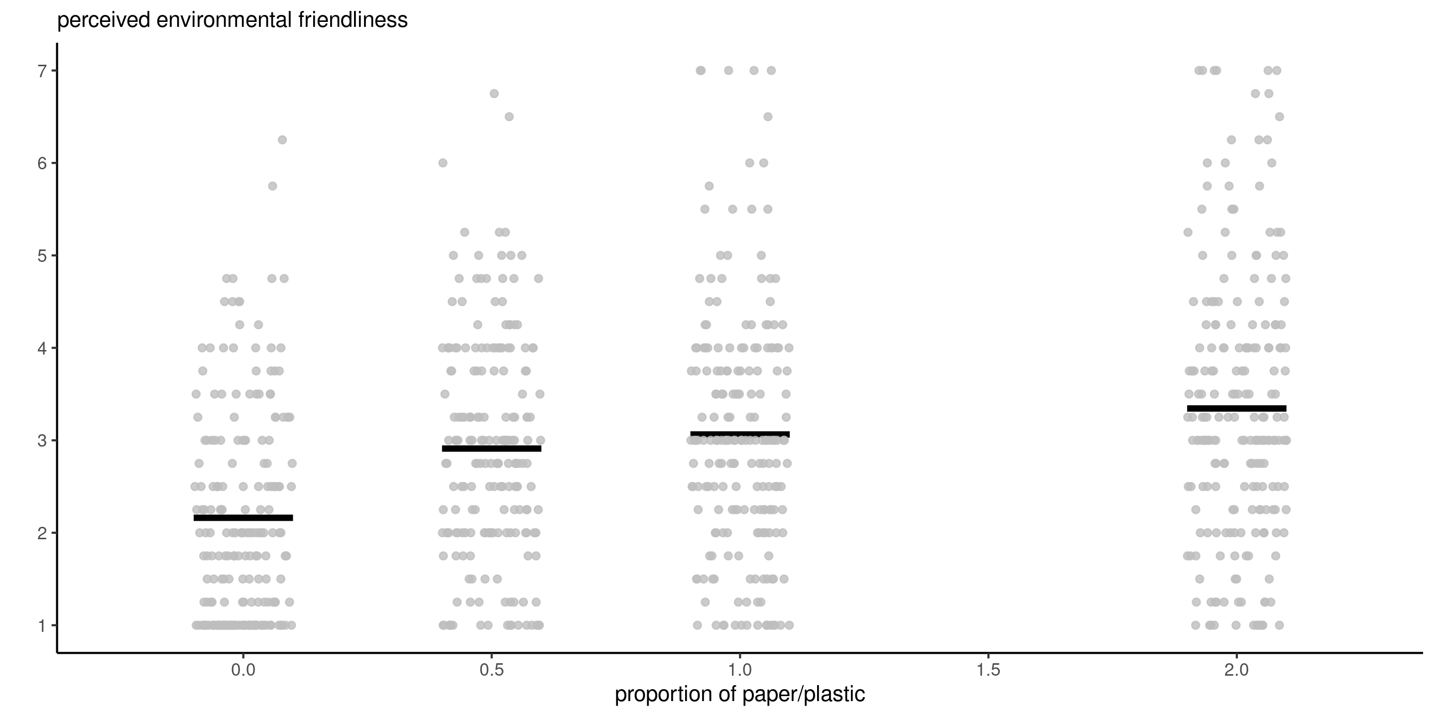 The group averages suggest an increased perceived environmental friendliness as the amount of paper used in the wrapping increases.
