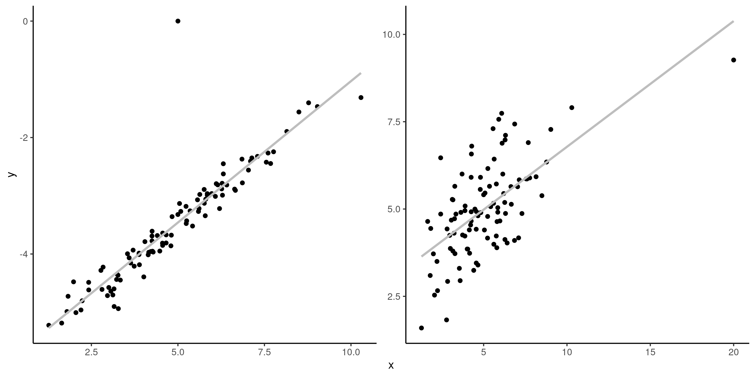 Figure 2: Outlier and influential observation. The left panel shows an outlier, whereas the right panel shows an influential variable (rightmost \(x\) value).