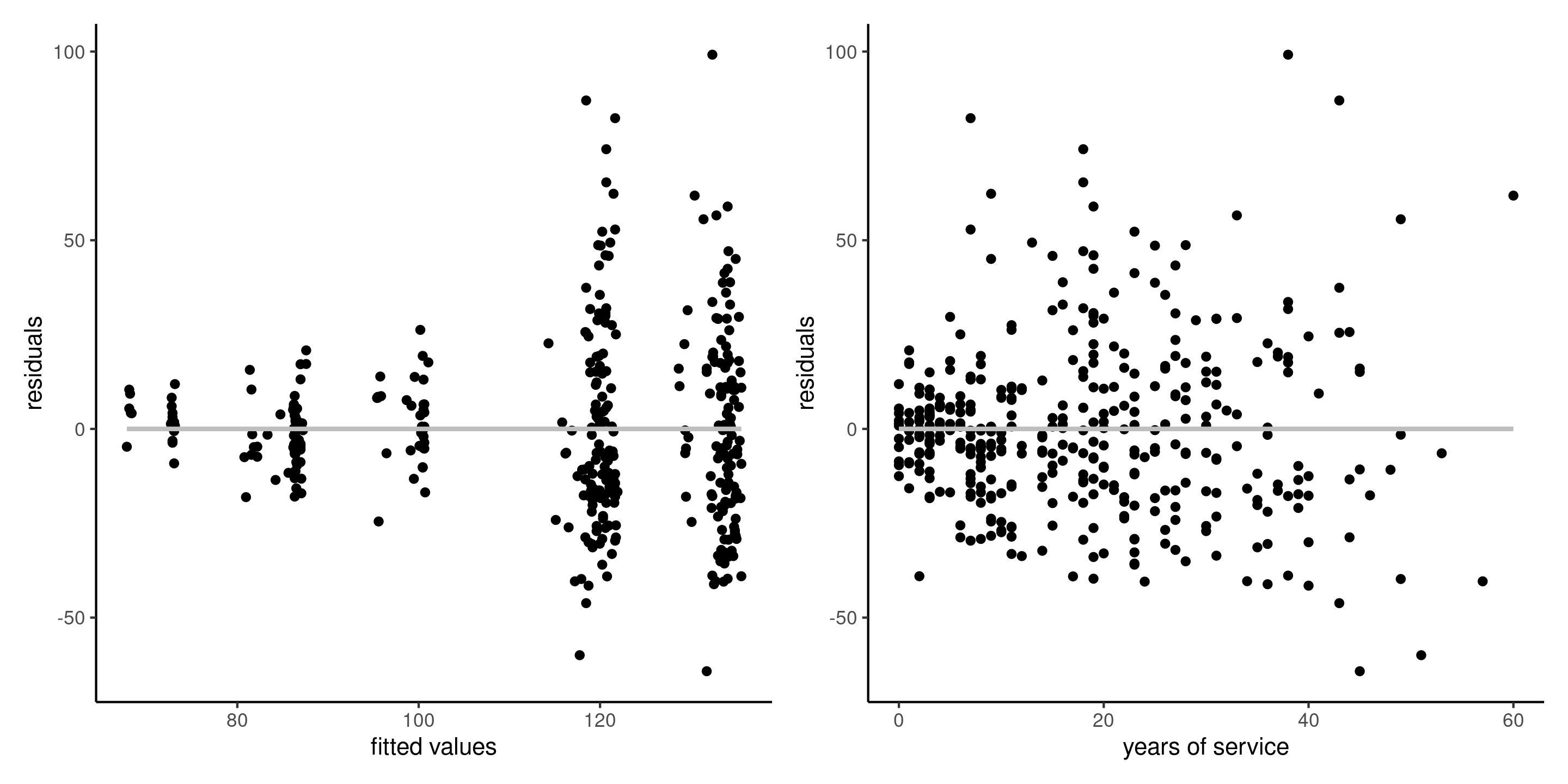 Figure 1: Plot of residuals against fitted values (left), and against the explanatory variable service (right) for the linear regression of the college data. The intercept and the slope of the simple linear regressions are zero.