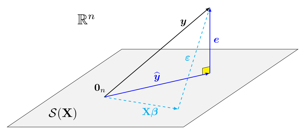 We can write the fitted values as the projection the observed response vector \(\boldsymbol{y}\) onto the linear span of the model matrix \(\mathbf{X}\), \[\begin{align*}