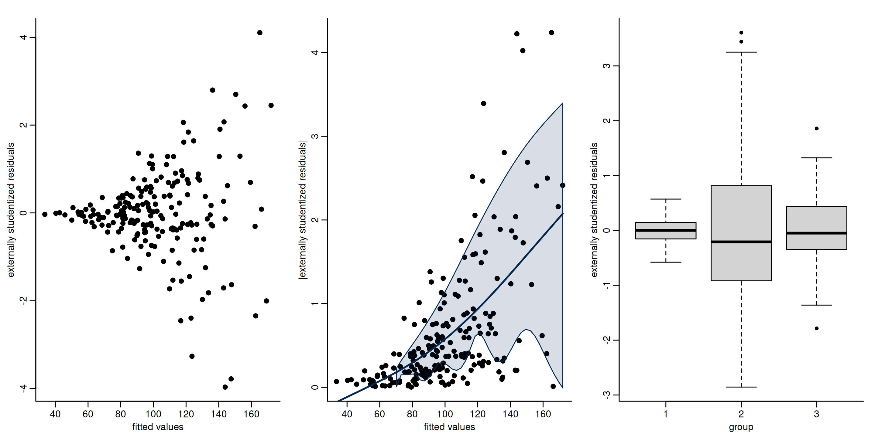 Figure 3: Plot of externally studentized residuals against fitted value (left) and categorical explanatory (right). Both clearly display heteroscedasticity.