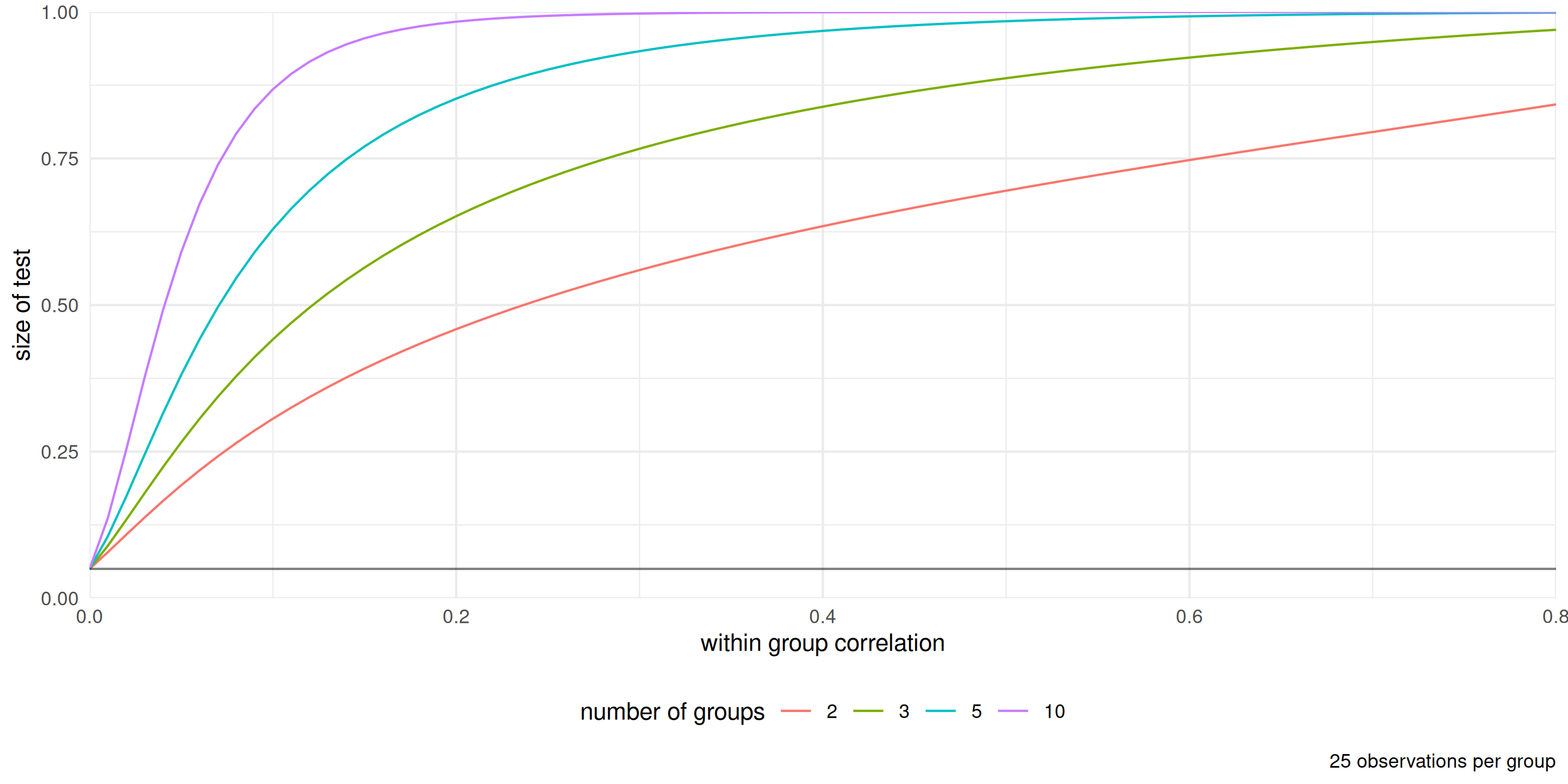 Figure 5: Percentage of rejection of the null hypothesis for the \(F\)-test of equality of means for the one way ANOVA with data generated with equal mean and variance from an equicorrelation model (within group observations are correlated, between group observations are independent). The nominal level of the test is 5%.