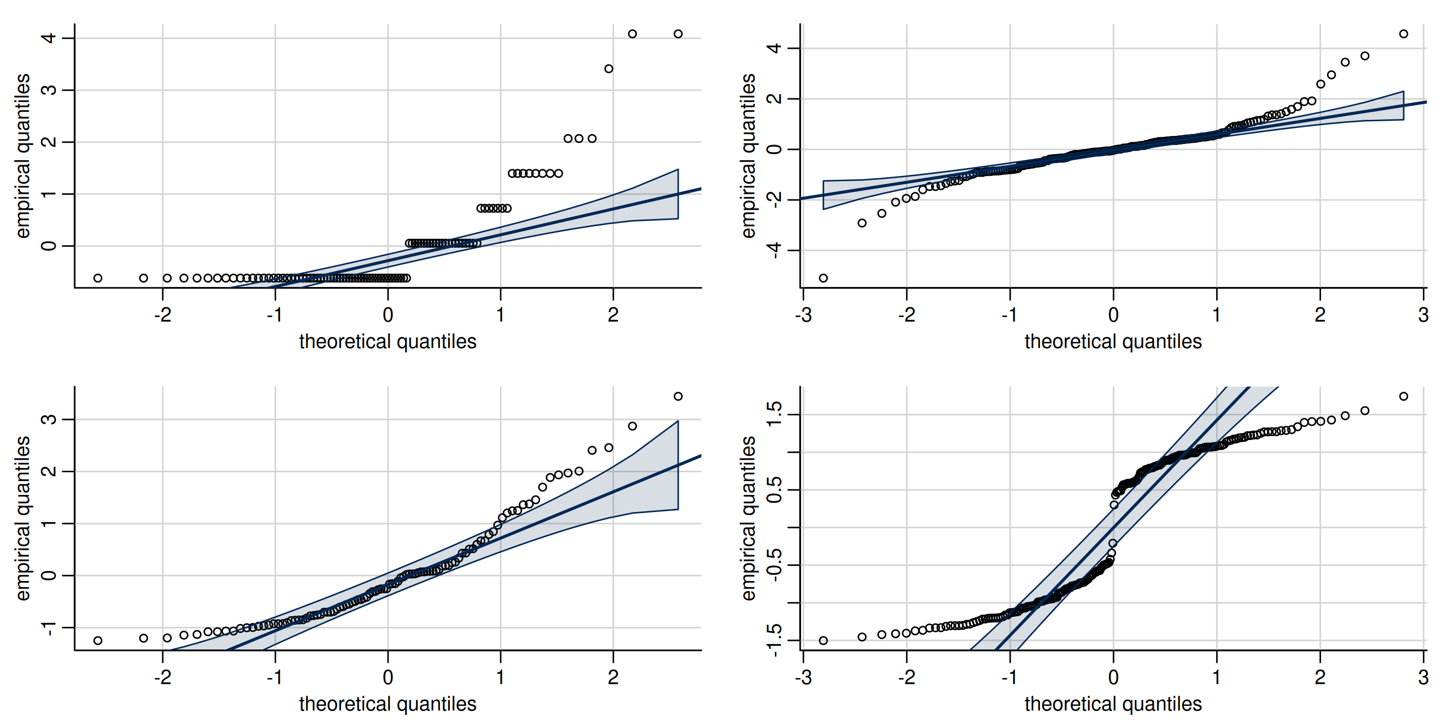 Figure 8: Quantile-quantile plots of non-normal data, showing typical look of behaviour of discrete (top left), heavy tailed (top right), skewed (bottom left) and bimodal data (bottom right).