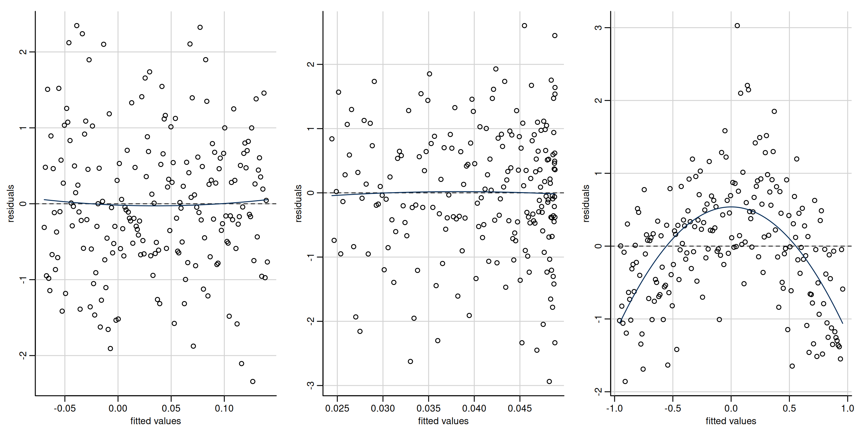 Figure 1: Scatterplots of residuals against fitted values. The first two plots show no departure from linearity (mean zero). The third plot shows a clear quadratic pattern, suggesting the mean model is misspecified. Note that the distribution of the fitted value need not be uniform, as in the second panel which shows more high fitted values.