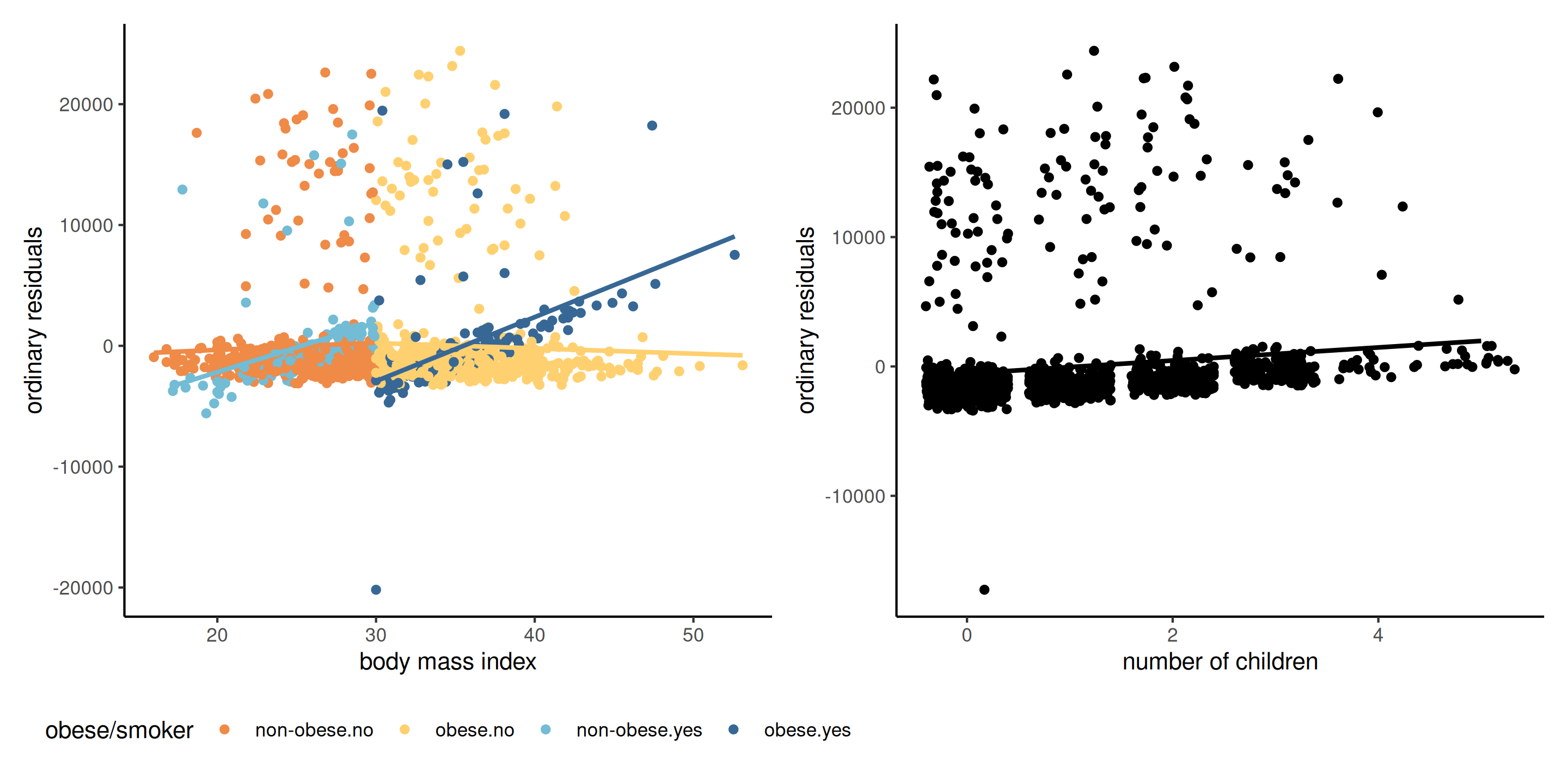 Figure 2: Scatterplot of residuals against explanatory (left) and an omitted covariate (right). We can pick up a forgotten interaction between BMI and smoker/obese and a linear trend for the number of children.