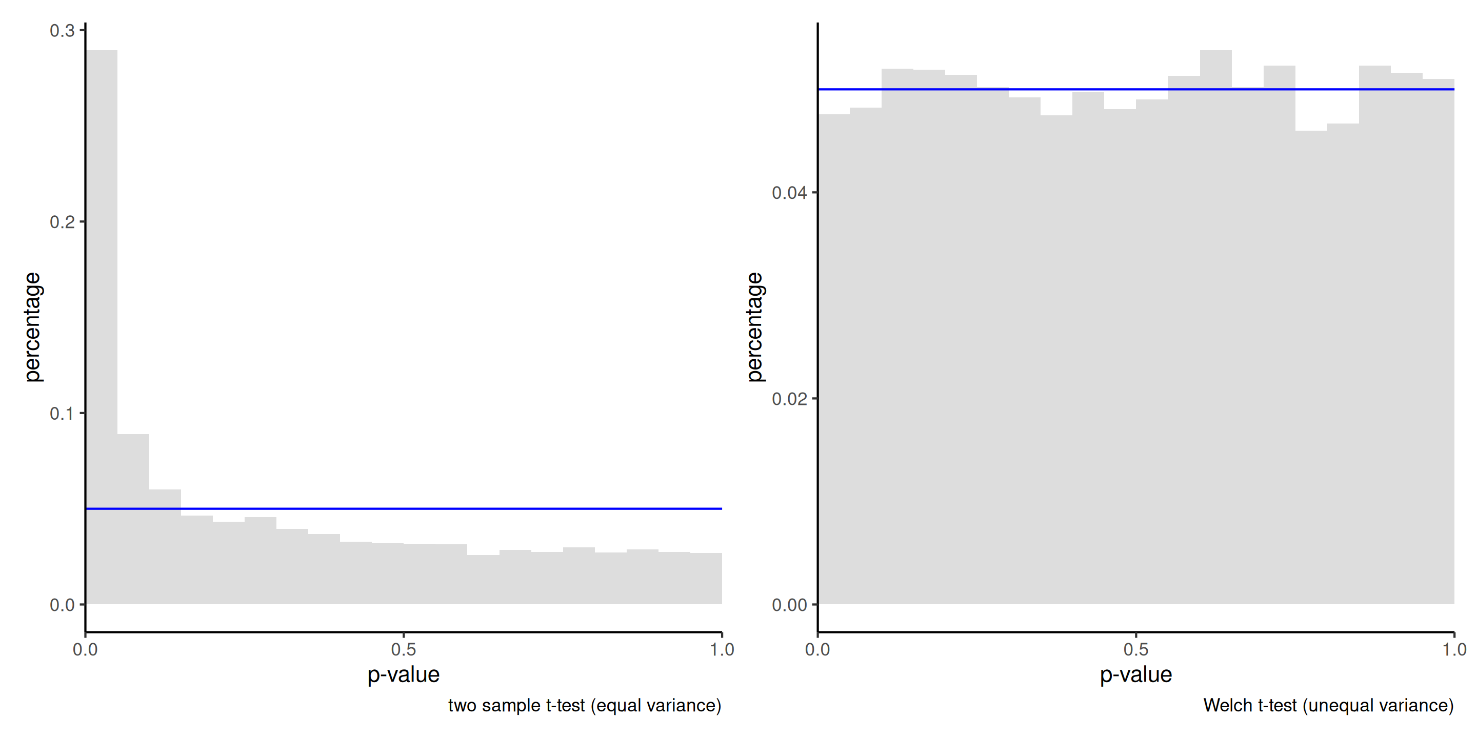 ## Chisquare = 70, Df = 2, p = 6e-16Figure 4: Histogram of the null distribution of \(p\)-values obtained through simulation using the two-sample \(t\)-test (left) and Welch’s \(t\)-test (right), based on 10 000 simulations. Each simulated sample consist of 50 observations from a \(\mathsf{normal}(0, 1)\) distribution and 10 observations from \(\mathsf{normal}(0, 9)\). The uniform distribution would have 5% in each of the 20 bins used for the display.