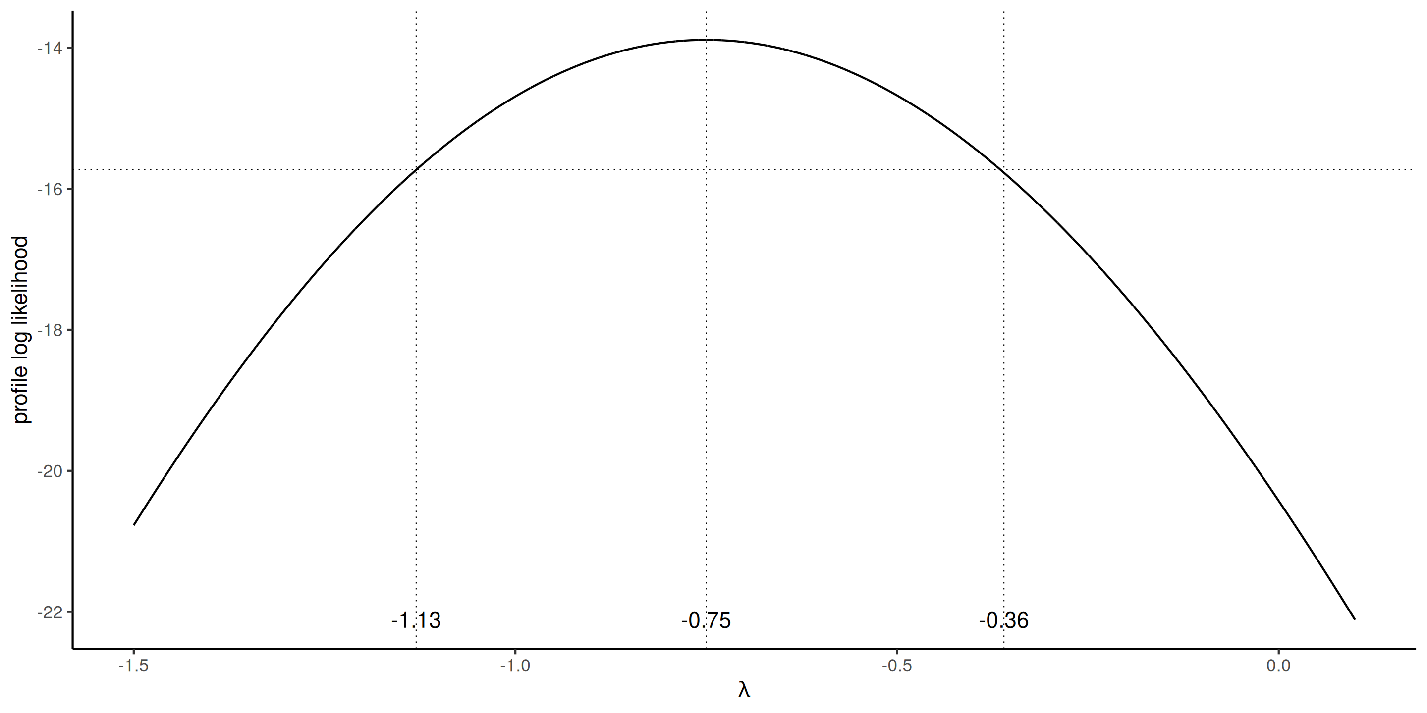 The profile log likelihood for the Box–Cox transform parameter, suggests a value of \(\lambda=-1\) would be within the 95% confidence interval.