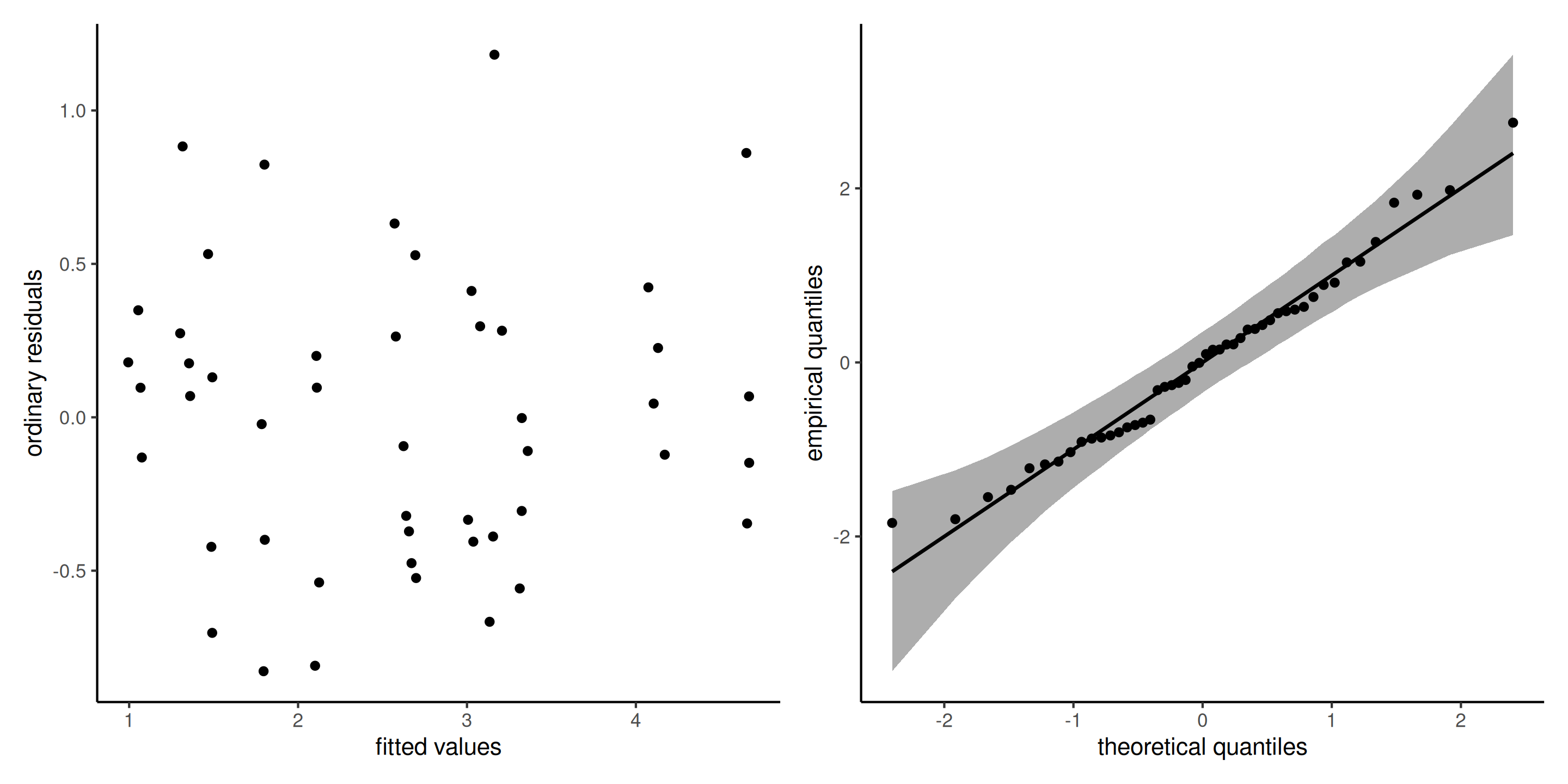 Figure 7: Histogram (left) and Student quantile-quantile plot (right) of the externally studentized residuals. The left panel includes a kernel density estimate (black), with the density of Student distribution (blue) superimposed. The right panel includes pointwise 95% confidence bands calculated using a bootstrap.