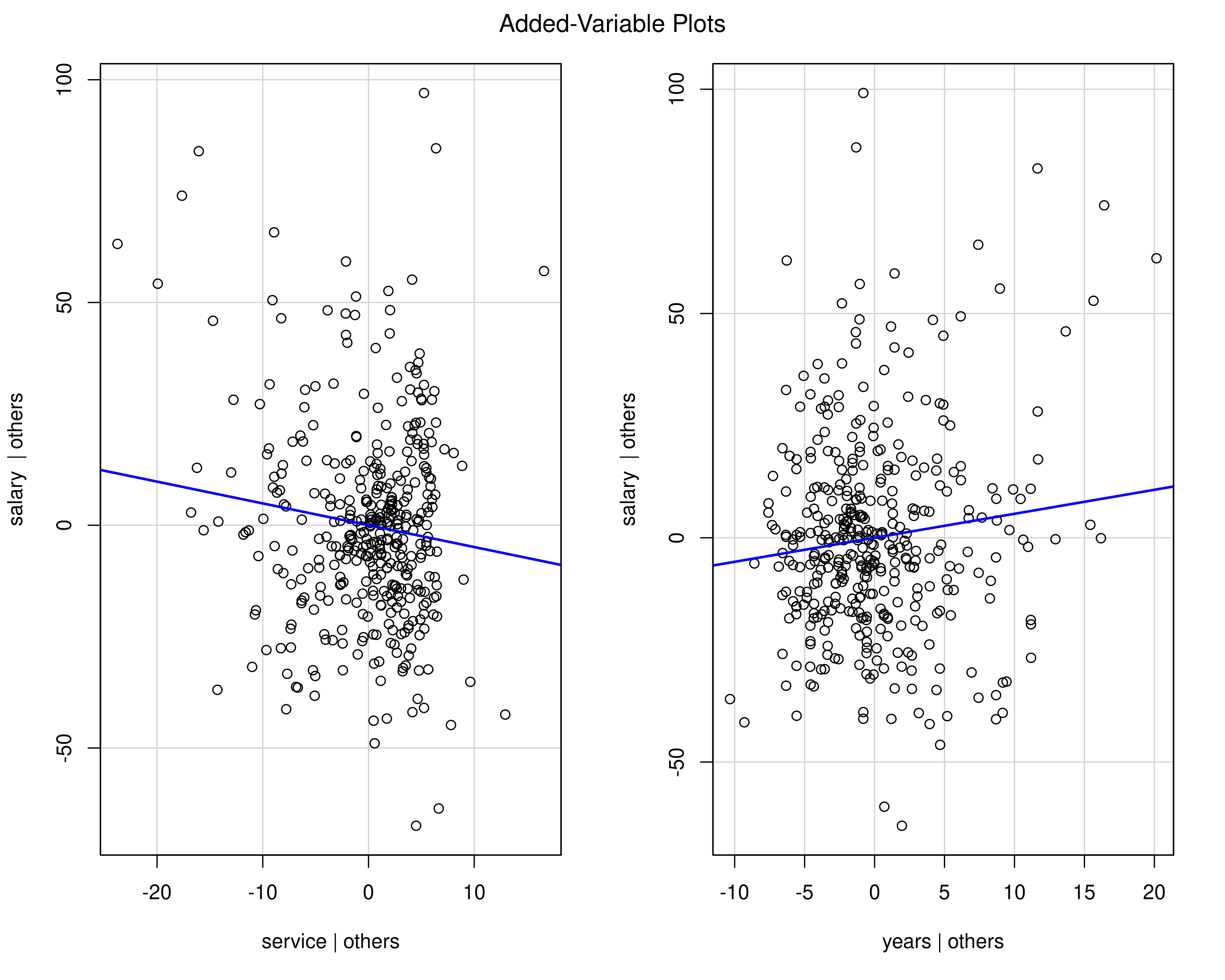 Figure 2: Added variable plots for years of service and years since PhD. Both are collinear and show no relationship once either is included.