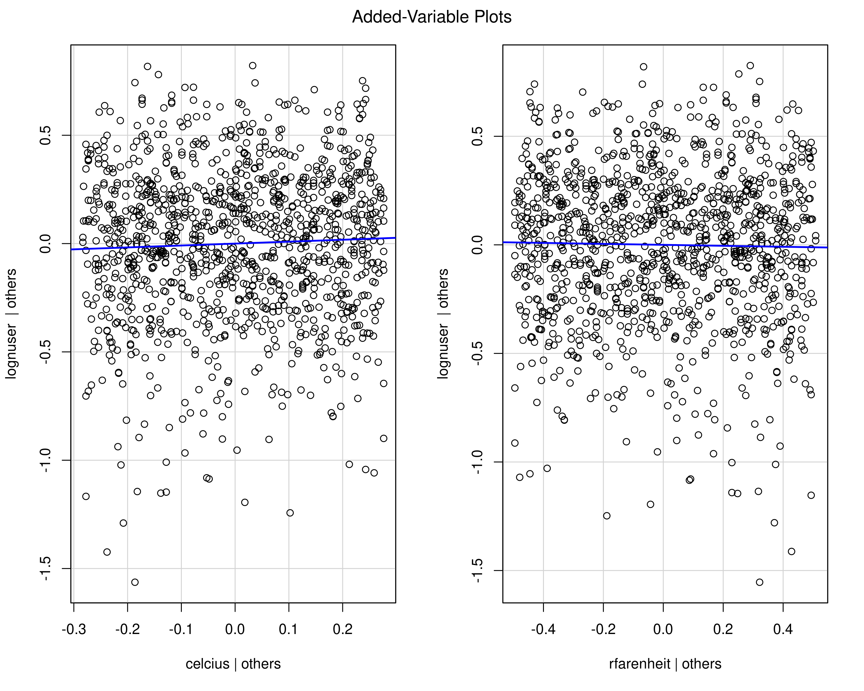 The coefficients for the model that only includes Farenheit are thus \[\begin{align*} \mathsf{E}(\texttt{lognuser} \mid \cdot)= \gamma_0 + \gamma_1\texttt{farenheit}, \end{align*}\] where \(\alpha_0 = \gamma_0 + 32\gamma_1\) and \(1.8\gamma_1 = \alpha_1\).